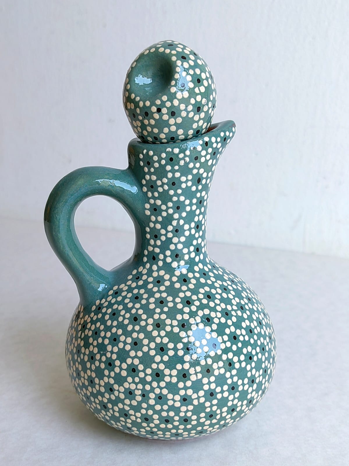 Aceitero originario de Capula, con el tramado característico de la zona. Fondo de color sólido con sellos florales al rededor. Todo esmaltado y elaborado en barro. Medidas: Diámetro: 7.5 cms, Largo: 8 cms. y Alto: 15 cms. Pieza libre de plomo.