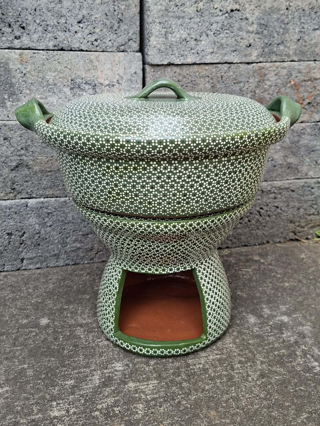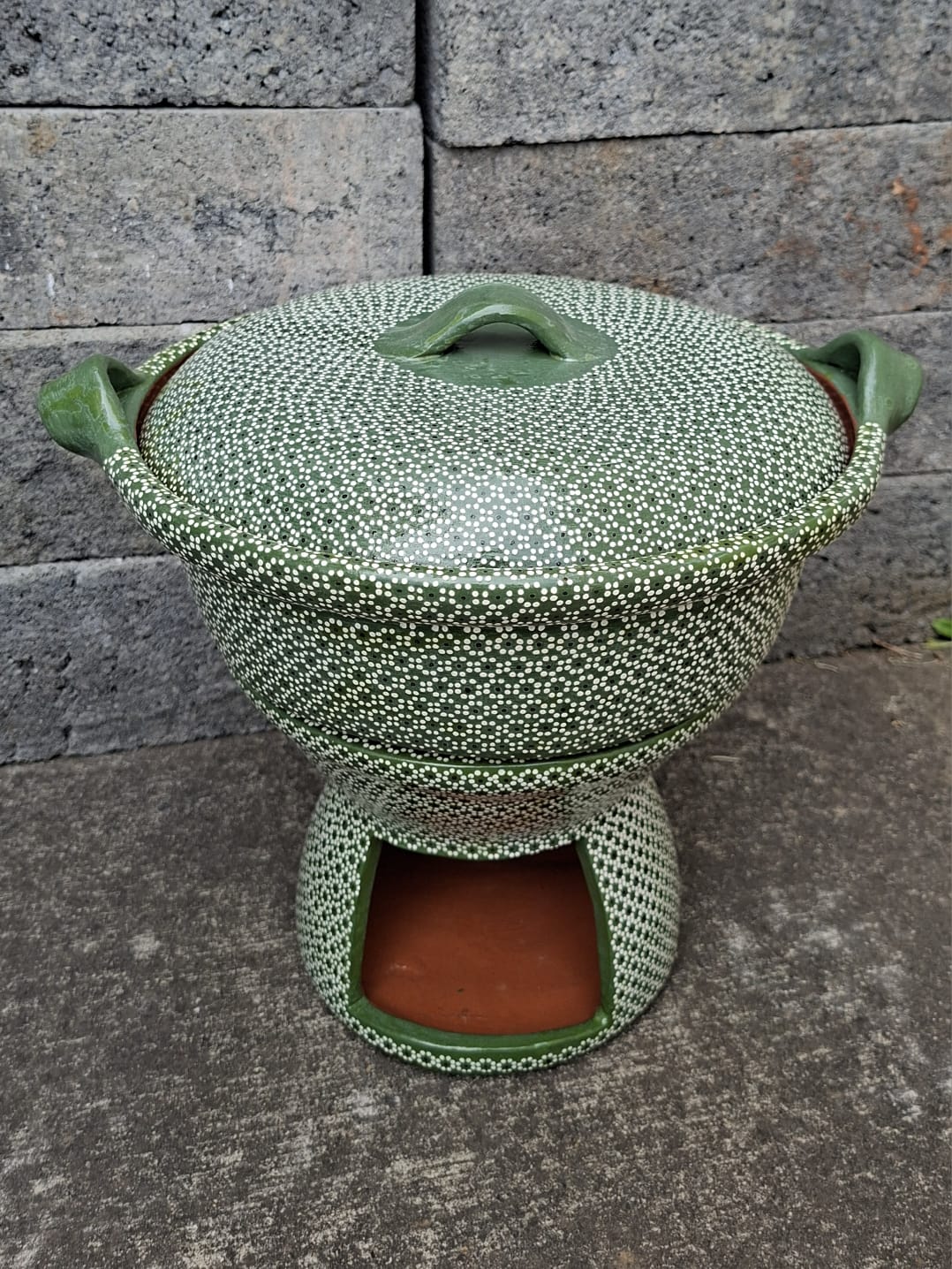 Anafre y cazuela originaria de Capula, con el tramado característico de la zona. Fondo de color sólido con sellos florales al rededor. Todo esmaltado y elaborado en barro. Pieza libre de plomo.