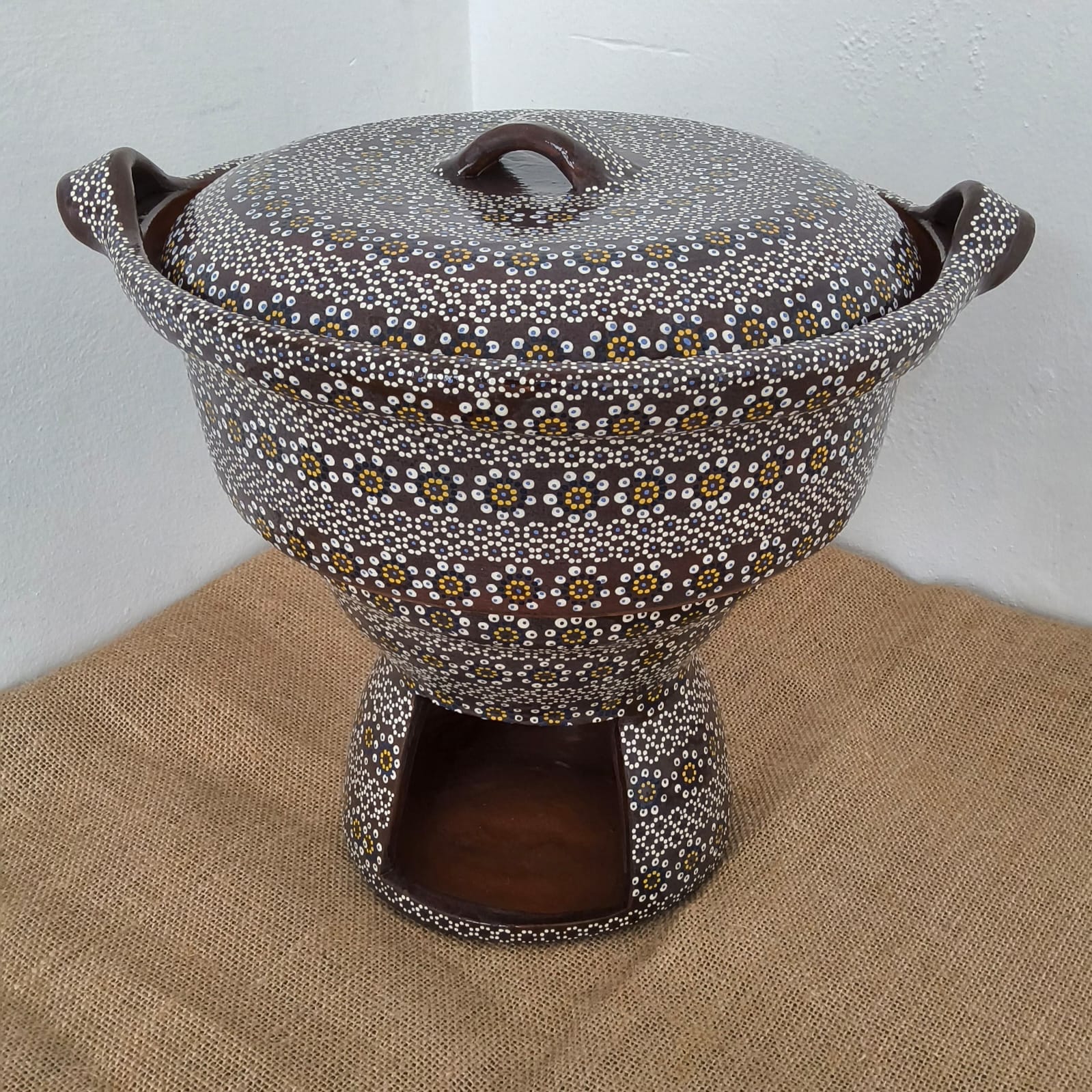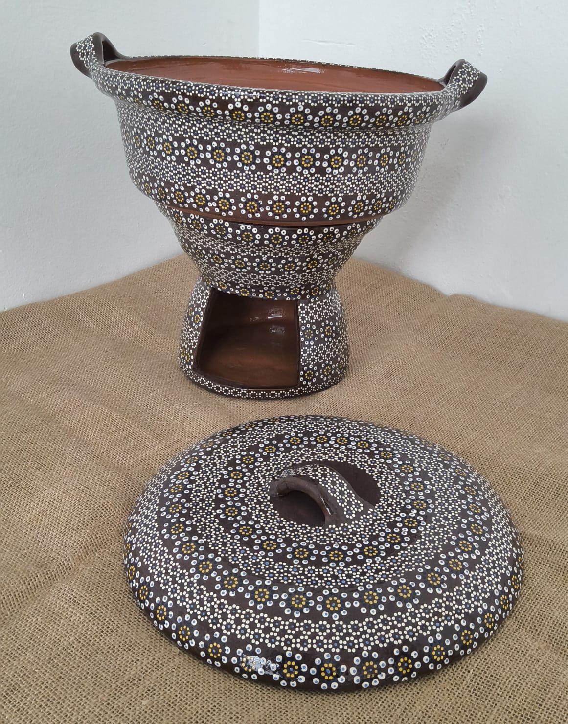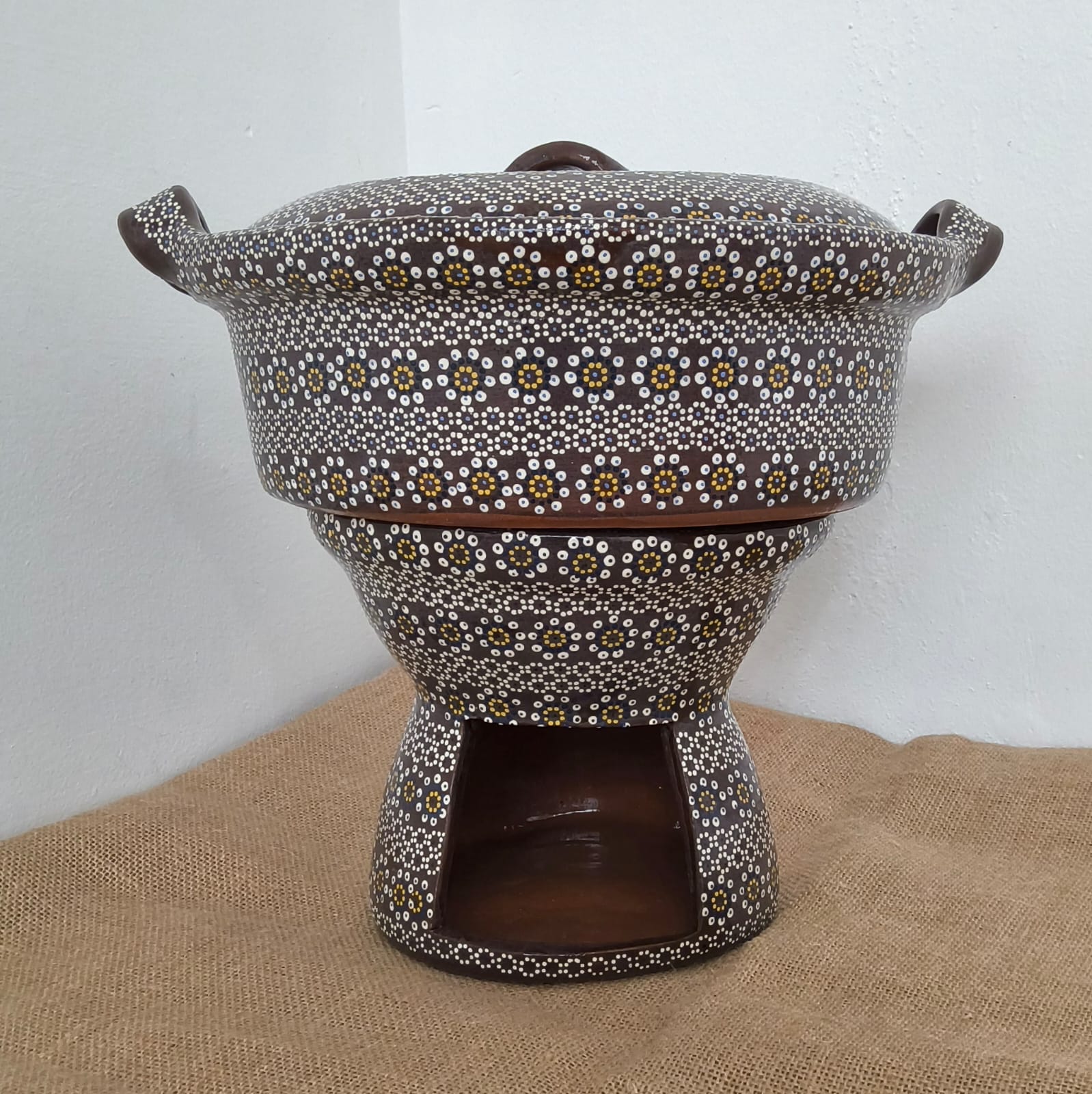 Anafre y cazuela originaria de Capula, con el tramado característico de la zona. Fondo de color sólido con sellos florales al rededor. Todo esmaltado y elaborado en barro. Pieza libre de plomo.