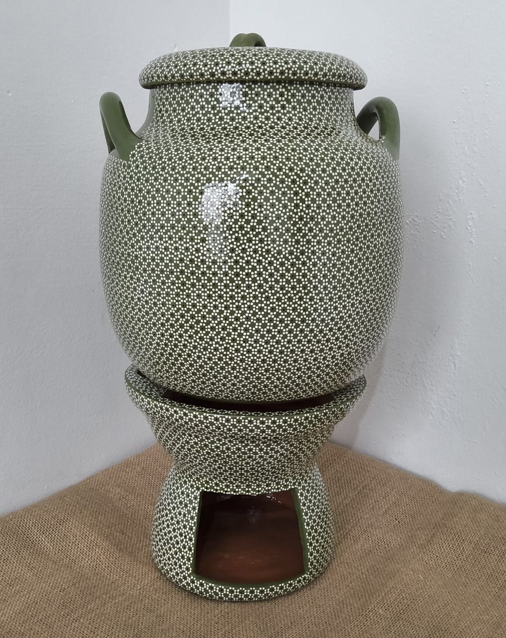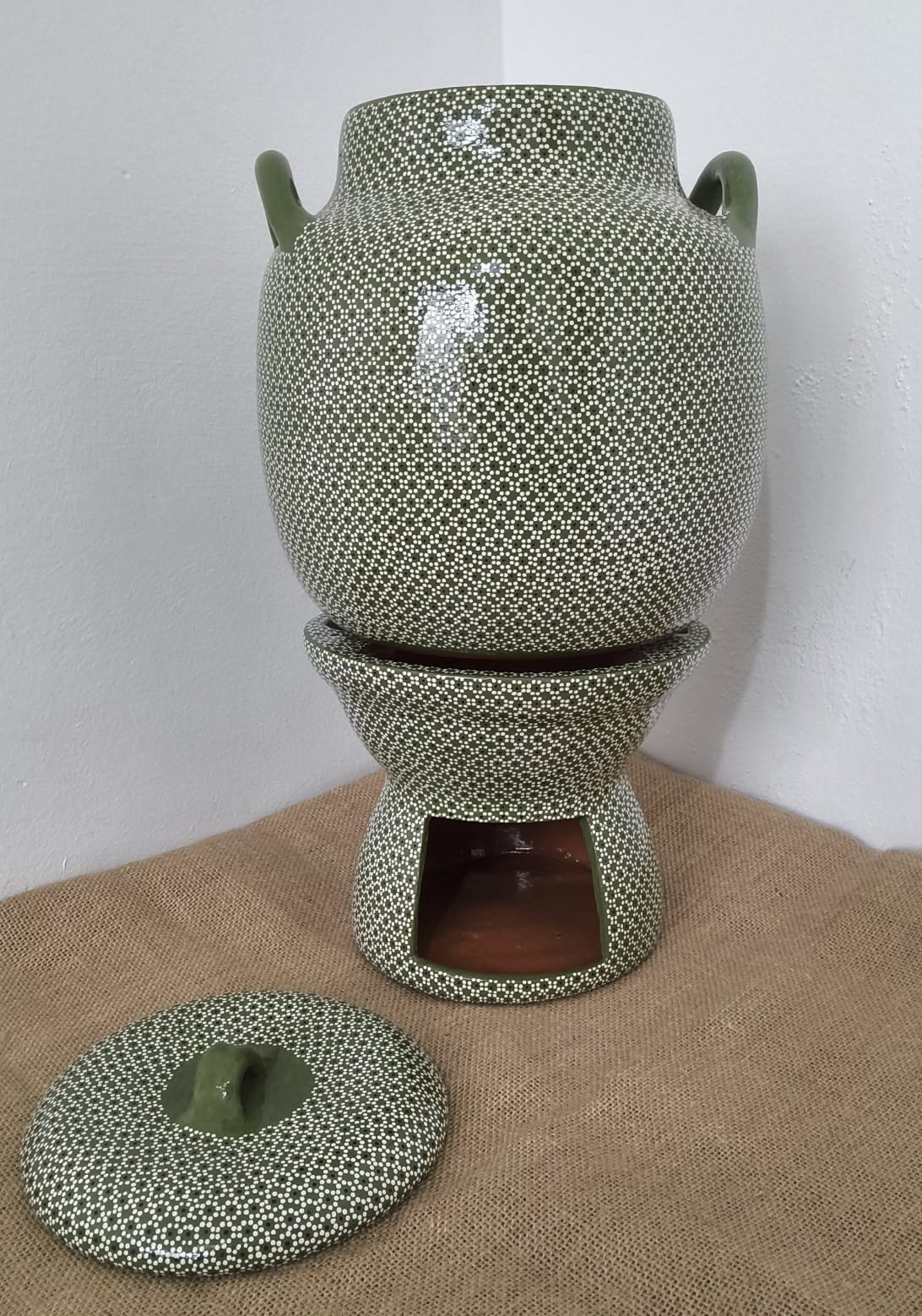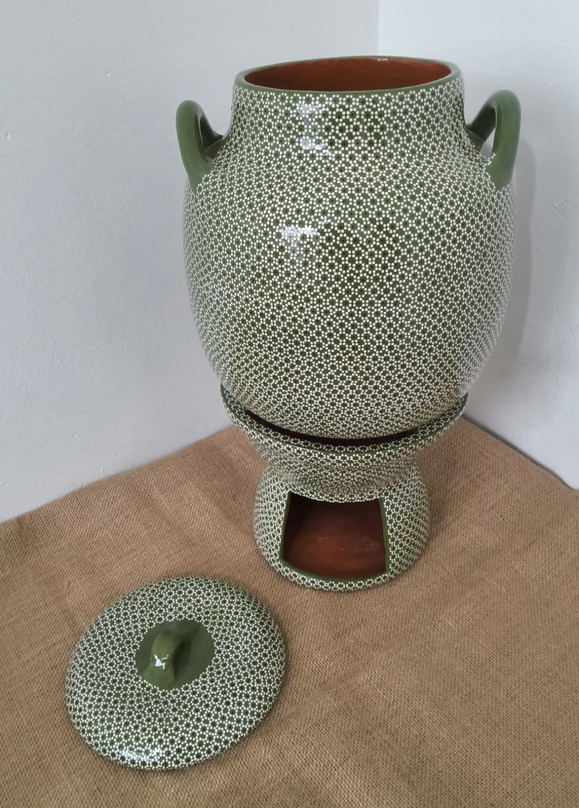 Anafre y olla originaria de Capula, con el tramado característico de la zona. Fondo de color sólido con sellos florales al rededor. Todo esmaltado y elaborado en barro. Pieza libre de plomo.