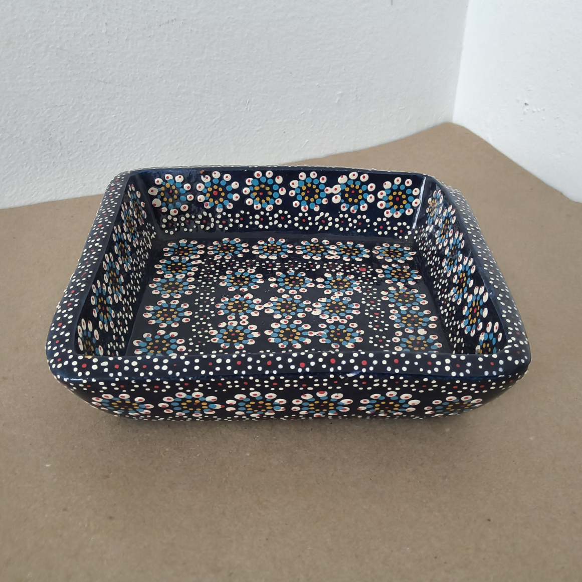 | Bandeja originaria de Capula, con el tramado característico de la zona. Fondo de color sólido con sellos florales al rededor. Toda esmaltada y elaborada en barro. Ideal como servilletero o contenedor de 9 tequileros. Pieza libre de plomo. |