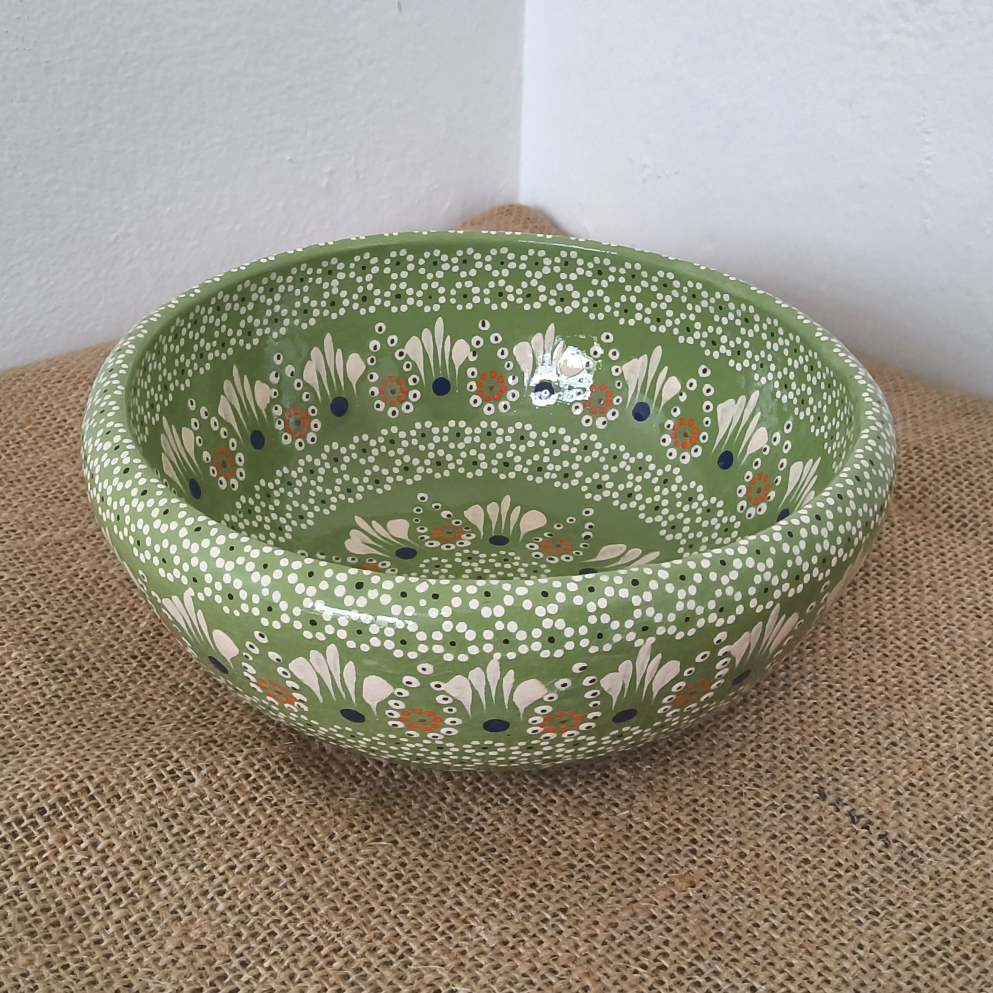 Tazón originario de Capula, con el tramado característico de la zona. Fondo de color sólido con sellos florales al rededor. Todo esmaltado y elaborado en barro.Ideal para consomé, sopa o pozole. Soporta altas temperaturas. Puede meter al horno de microondas. Medidas: Diámetro: 17 cms., alto: 6.5 cms. Pieza libre de plomo.