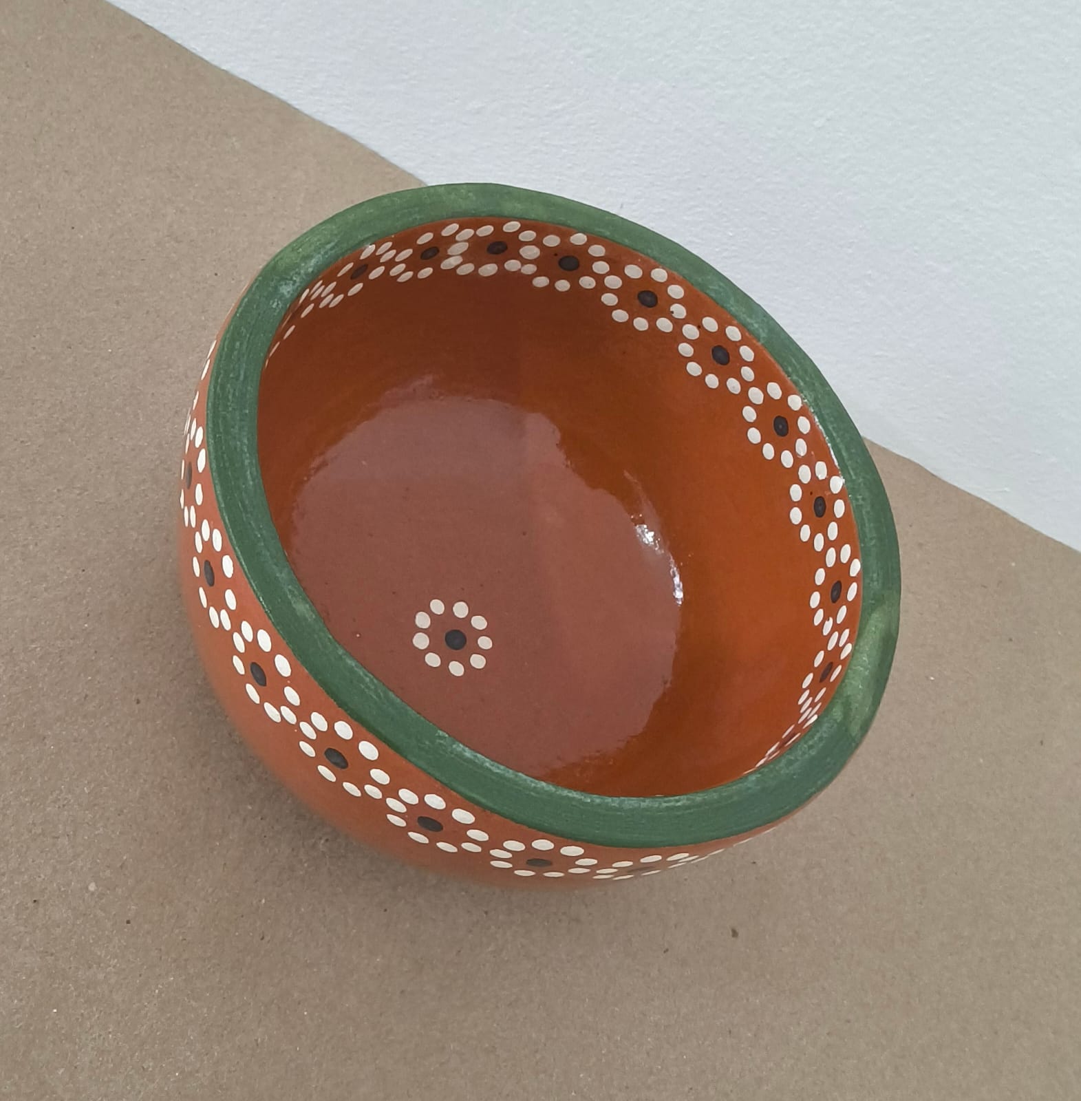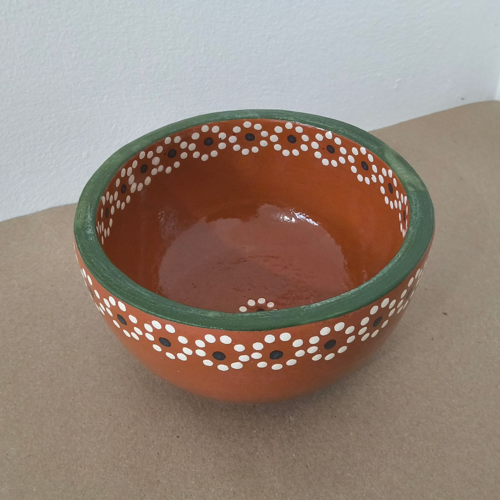 Tazón originario de Capula, con el tramado característico de la zona. Fondo de color sólido con sellos florales al rededor. Todo esmaltado y elaborado en barro.Ideal como botanero o para helado. Soporta altas temperaturas. Puede meter al horno de microondas. Medidas: Diámetro: 14 cms., alto: 7 cms. Pieza libre de plomo.