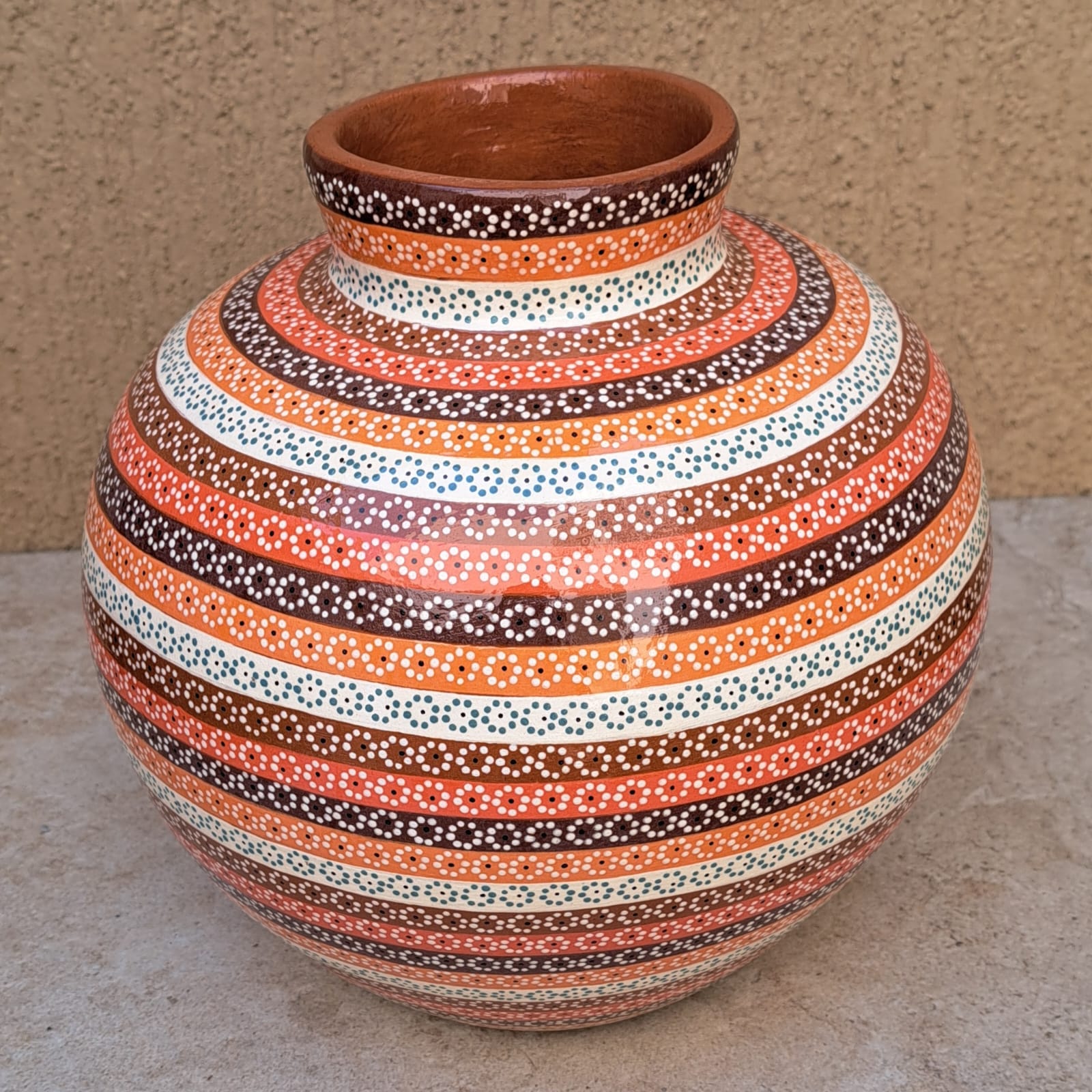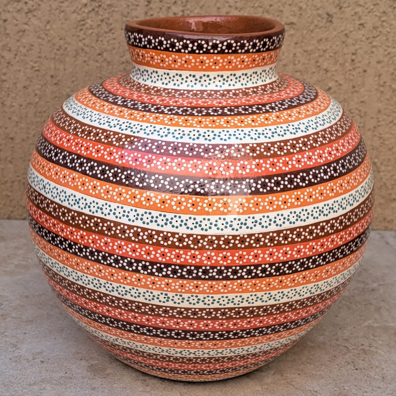 Cántaro originario de Capula, con el tramado característico de la zona. Fondo de color sólido con sellos florales al rededor. Todo esmaltado y elaborado en barro. Ideal como florero o contenedor de agua. Medidas: Diámetro: 23 cms., Alto: 23 cms. Pieza libre de plomo.