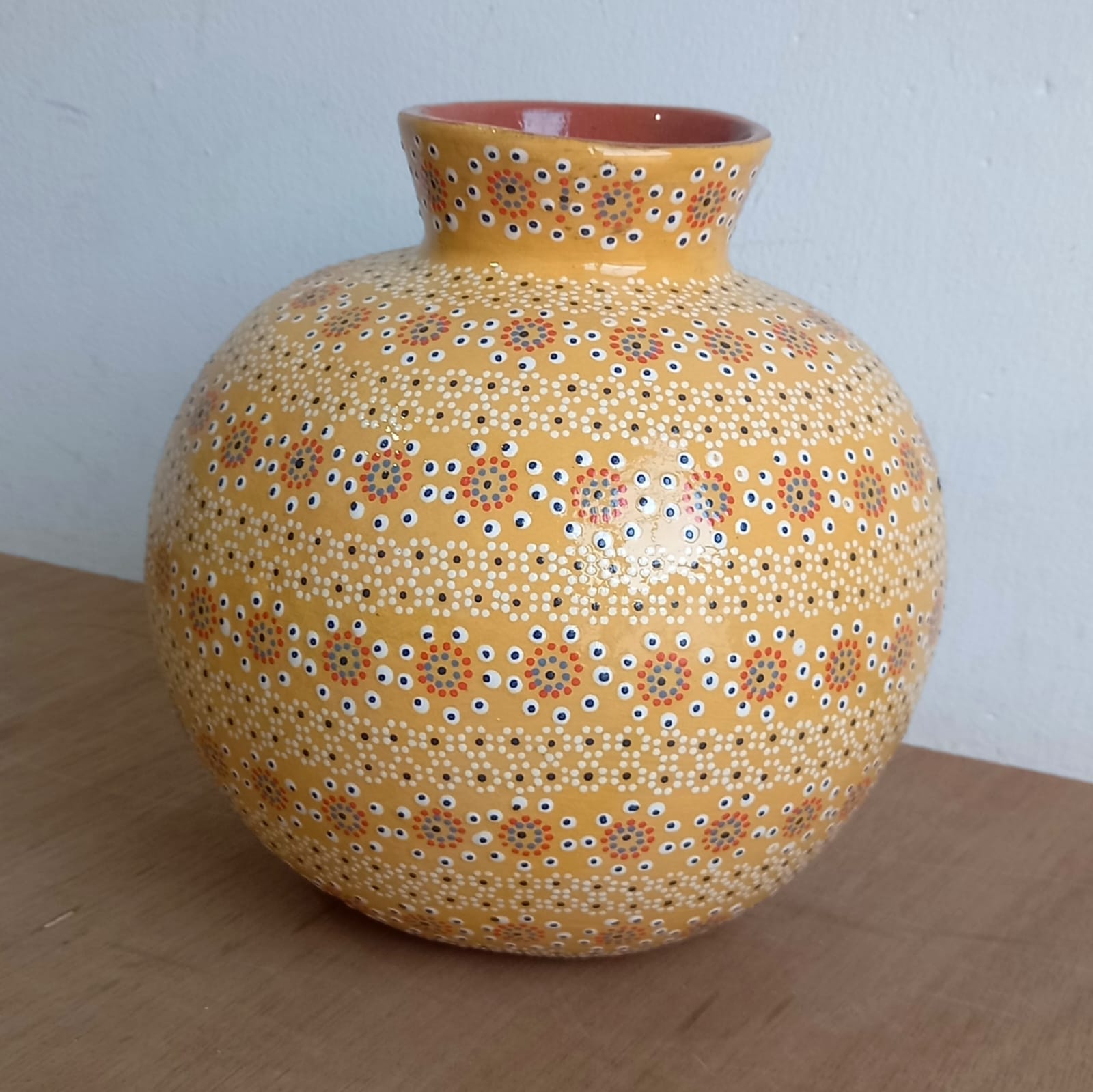 Cántaro originario de Capula, con el tramado característico de la zona. Fondo de color sólido con sellos florales al rededor. Todo esmaltado y elaborado en barro. Ideal como florero o contenedor de agua. Medidas: Diámetro: 20 cms., Alto: 21 cms. Pieza libre de plomo.