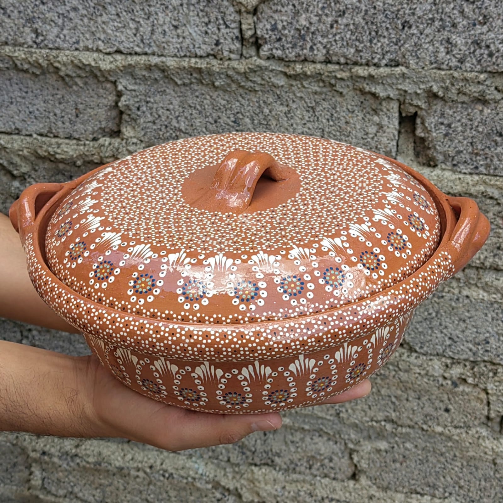 Cazuela originaria de Capula, con el tramado característico de la zona. Fondo de color sólido con sellos florales al rededor. Toda esmaltada y elaborada en barro. Ideal para guisados. Se puede colocar a fuego directo. Incluye 2 piezas. Medidas: Largo de asa a asa: 31 cms, Diámetro: 27 cms., Altura: 13.5 cms. Pieza libre de plomo.