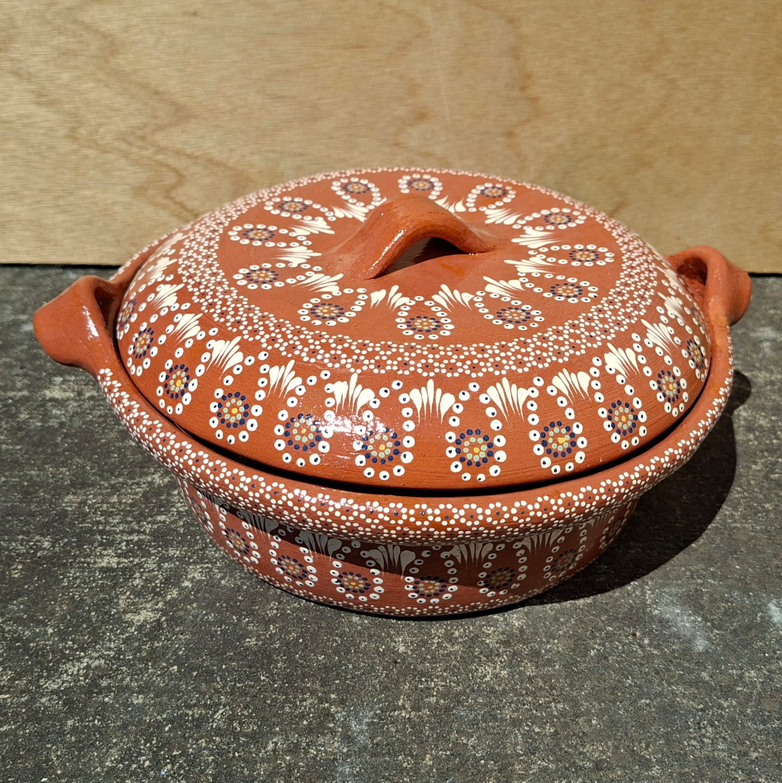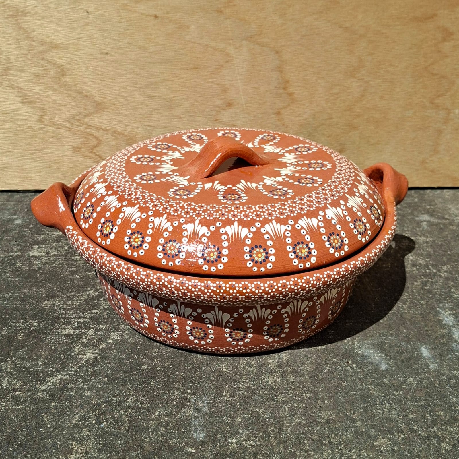 Cazuela originaria de Capula, con el tramado característico de la zona. Fondo de color sólido con sellos florales al rededor. Toda esmaltada y elaborada en barro. Ideal para guisados. Se puede colocar a fuego directo. Incluye 2 piezas. Medidas: Largo de asa a asa: 31 cms, Diámetro: 26.5 cms., Altura: 9 cms. Pieza libre de plomo. Capacidad: 2.800 litros.