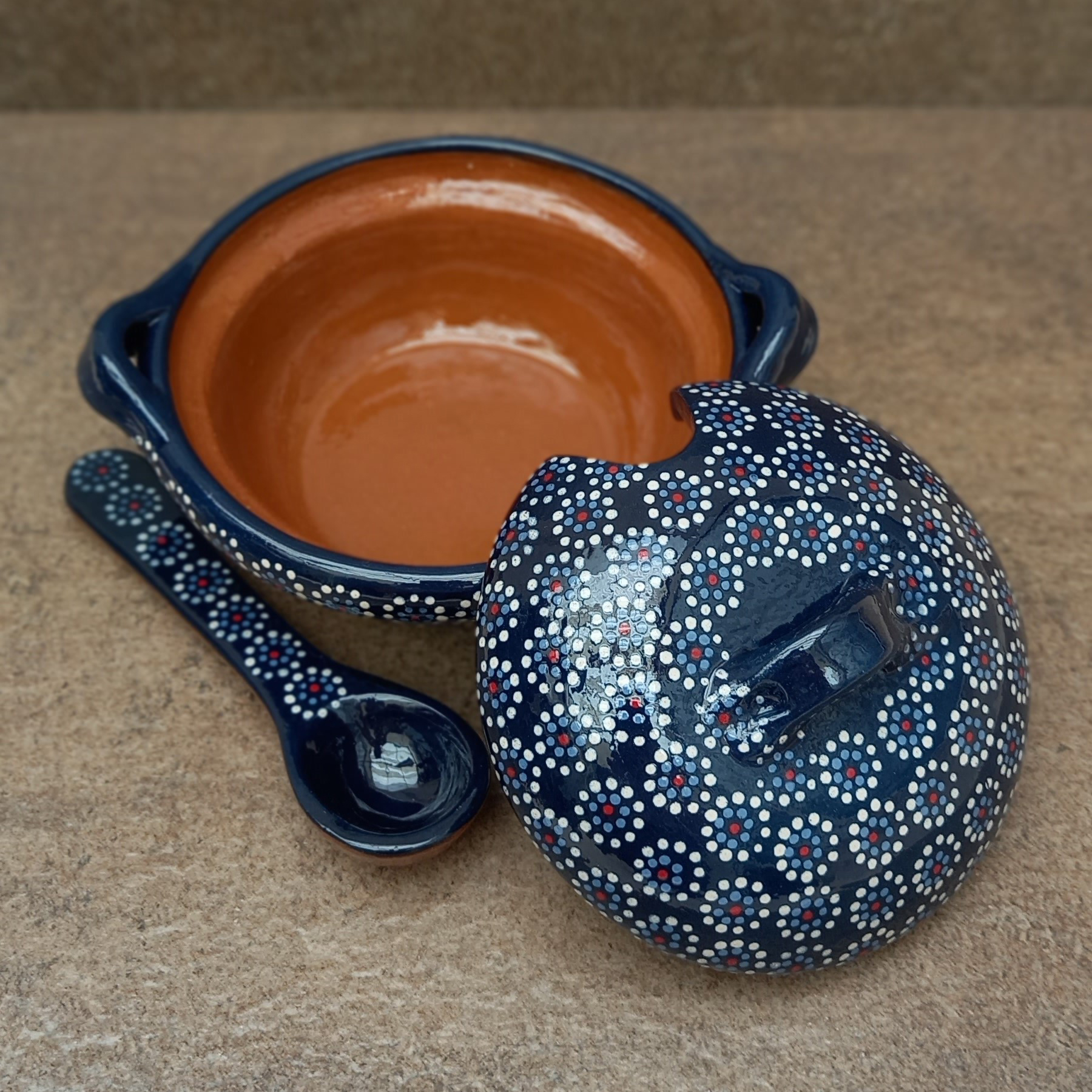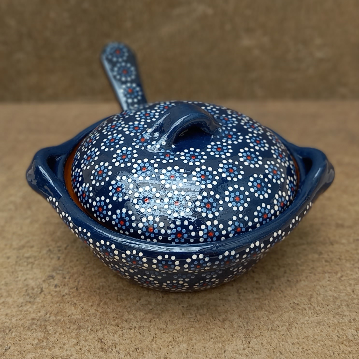 Cazuelita originaria de Capula, con el tramado característico de la zona. Fondo de color sólido con sellos florales al rededor. Toda esmaltada y elaborada en barro. Ideal para salsas o quesos fundidos. Se puede colocar a fuego directo y también se puede meter al horno de microondas. Medidas: Diámetro: 15 cms, Ancho de asa a asa: 17 cms, Alto 7.50 cms. Capacidad: 400 ml. Pieza libre de plomo.