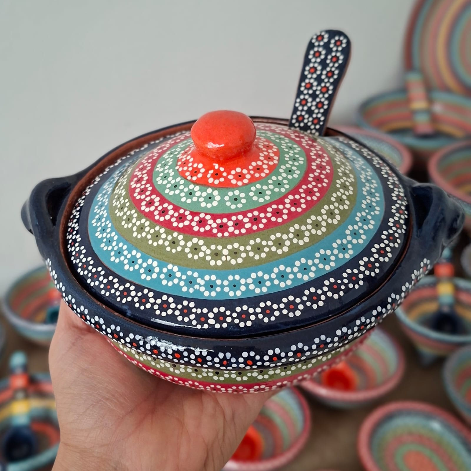 Cazuelita originaria de Capula, con el tramado característico de la zona. Fondo de color sólido con sellos florales al rededor. Toda esmaltada y elaborada en barro. Ideal para salsas o quesos fundidos. Se puede colocar a fuego directo y también se puede meter al horno de microondas. Medidas: Diámetro: 15 cms, Ancho de asa a asa: 17 cms, Alto 7.50 cms. Capacidad: 400 ml. Pieza libre de plomo.