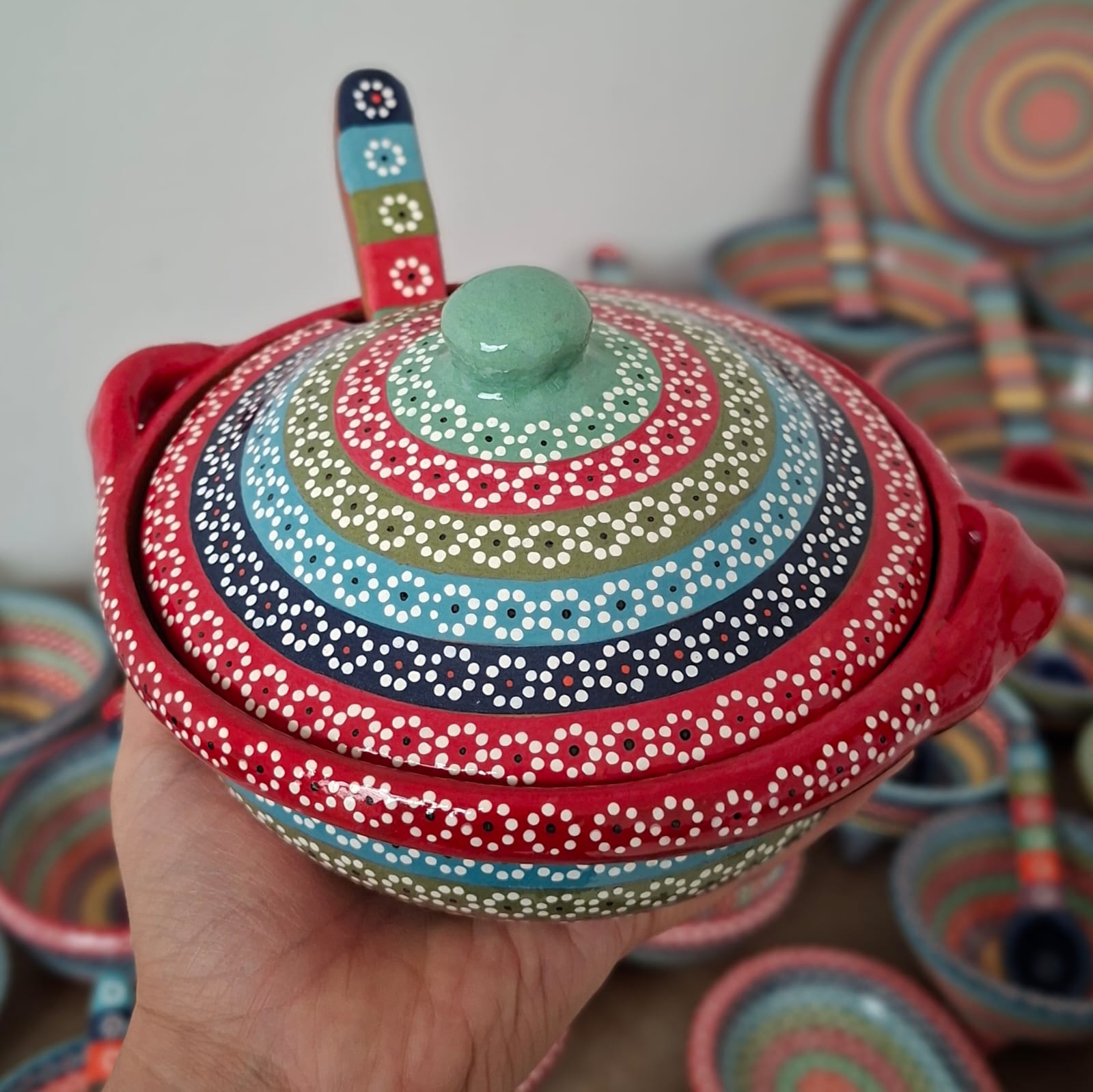 Cazuelita originaria de Capula, con el tramado característico de la zona. Fondo de color sólido con sellos florales al rededor. Toda esmaltada y elaborada en barro. Ideal para salsas o quesos fundidos. Se puede colocar a fuego directo y también se puede meter al horno de microondas. Medidas: Diámetro: 15 cms, Ancho de asa a asa: 17 cms, Alto 7.50 cms. Capacidad: 400 ml. Pieza libre de plomo.