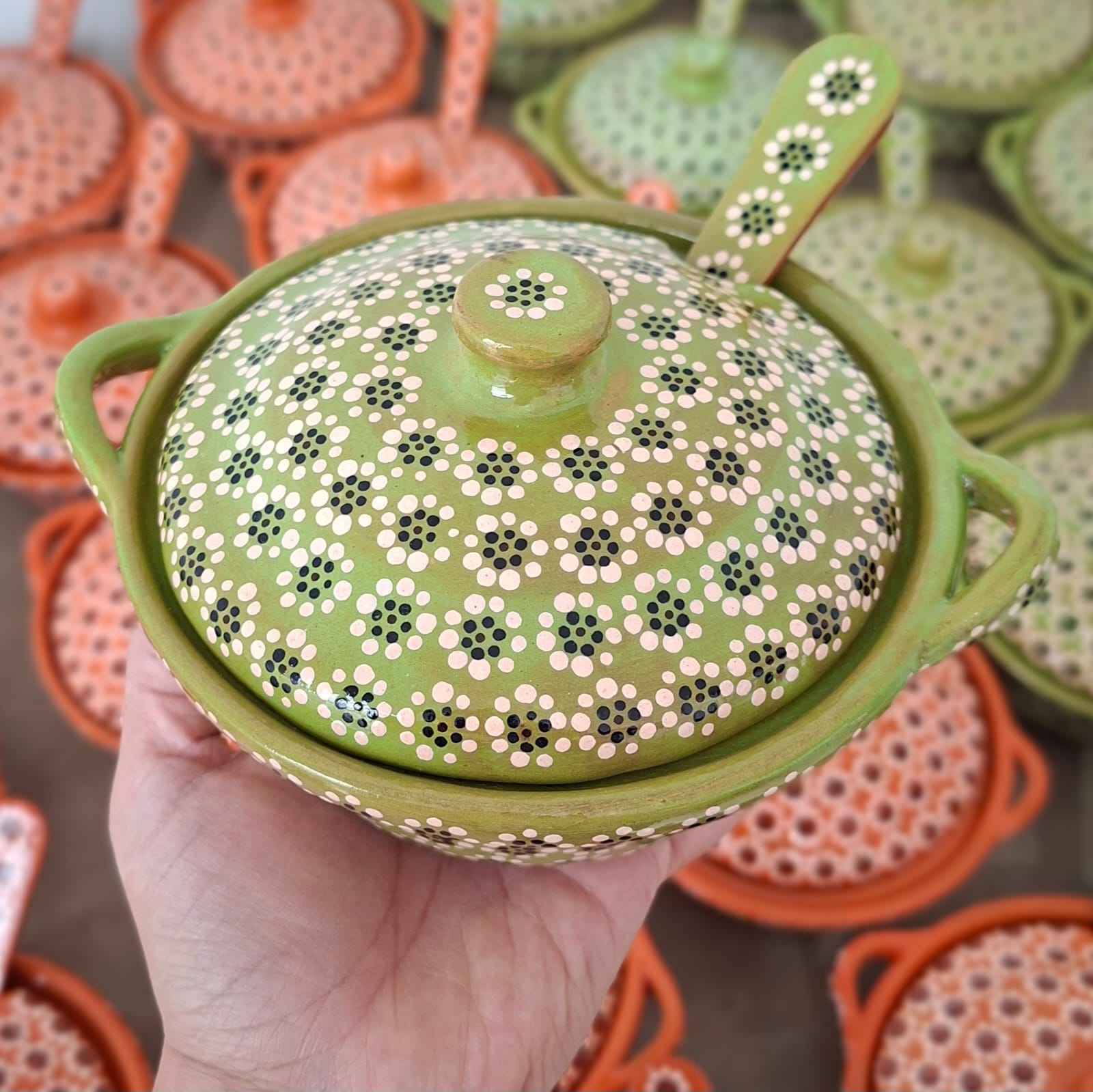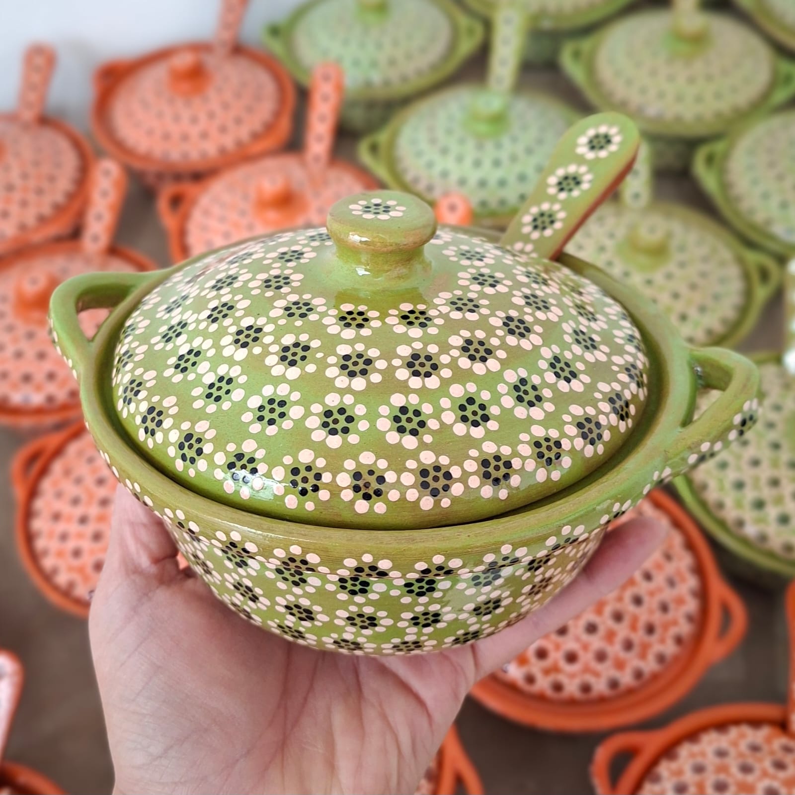 Cazuelita originaria de Capula, con el tramado característico de la zona. Fondo de color sólido con sellos florales al rededor. Toda esmaltada y elaborada en barro. Ideal para salsas o quesos fundidos. Se puede colocar a fuego directo y también se puede meter al horno de microondas. Medidas: Diámetro: 15 cms, Ancho de asa a asa: 17 cms, Alto 7.50 cms. Capacidad: 400 ml. Pieza libre de plomo.