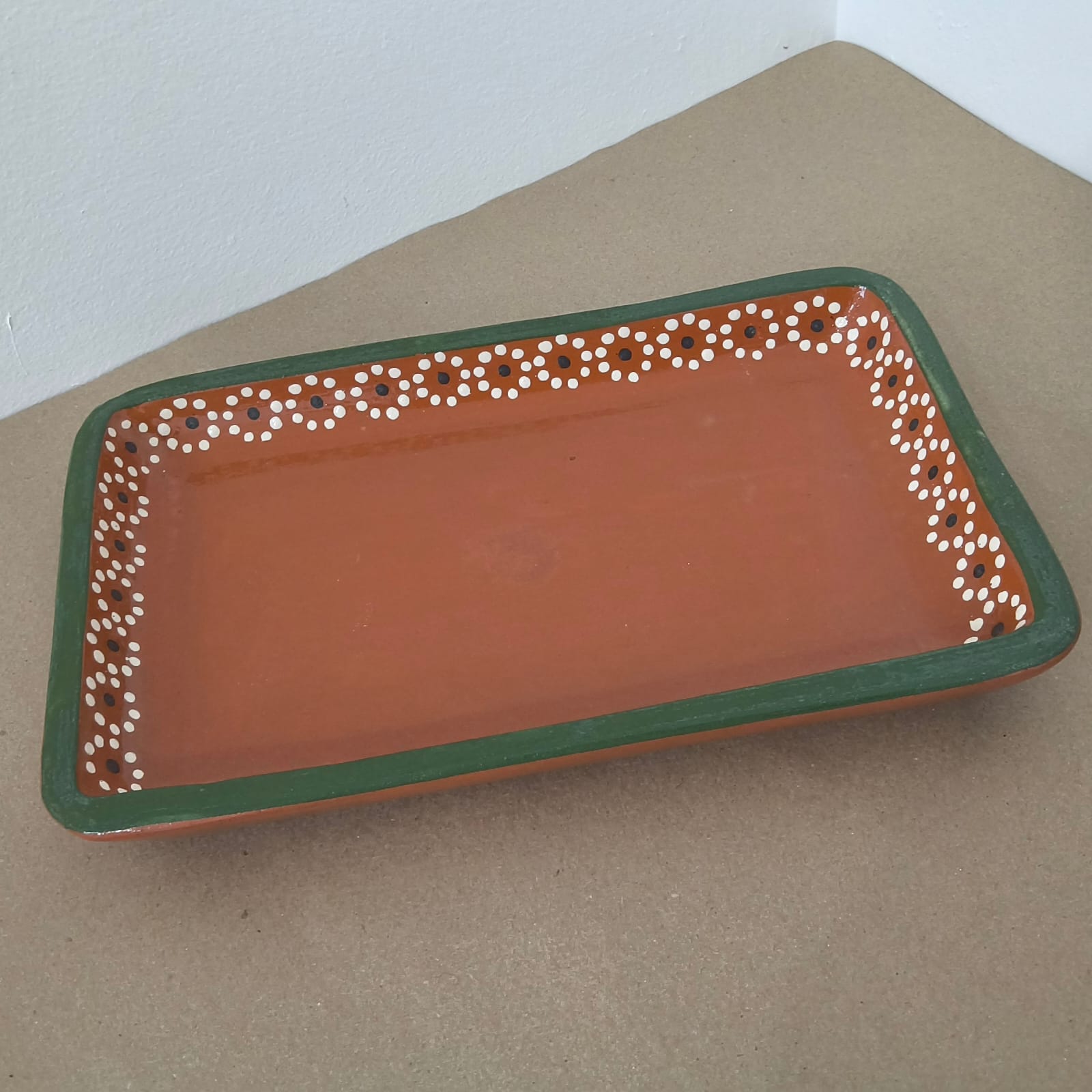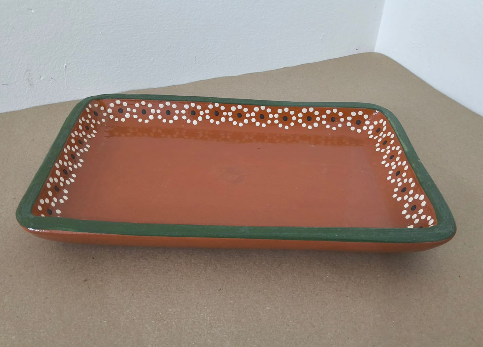 Charola originaria de Capula, con el tramado característico de la zona. Fondo de color sólido con sellos florales al rededor. Toda esmaltada y elaborada en barro. Ideal como bandeja pequeña. Medidas: Ancho: 18 cms., Largo: 29 cms. y alto: 3 cms. Pieza libre de plomo.