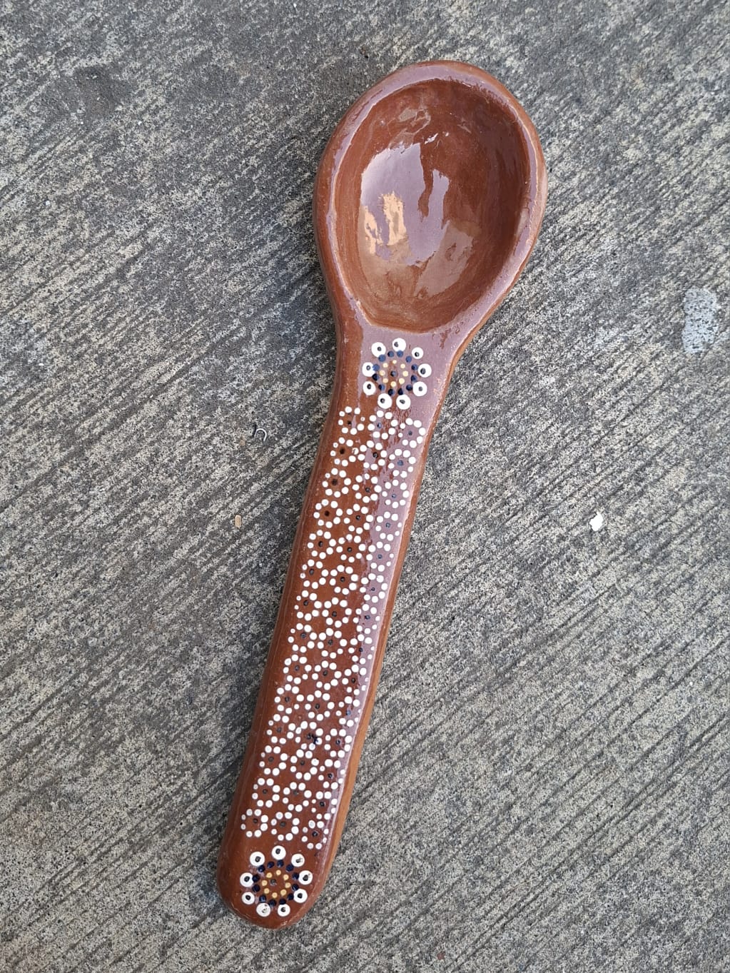 | Cuchara originaria de Capula, con el tramado característico de la zona. Fondo de color sólido con sellos florales al rededor. Toda esmaltada y elaborada en barro. Ideal para salsas y guisos. Soporta altas temperaturas. Puede meter al horno de microondas. Medidas: Diámetro: 24 cms., ancho: 6.5 cms. y alto: 3 cms. Pieza libre de plomo. |