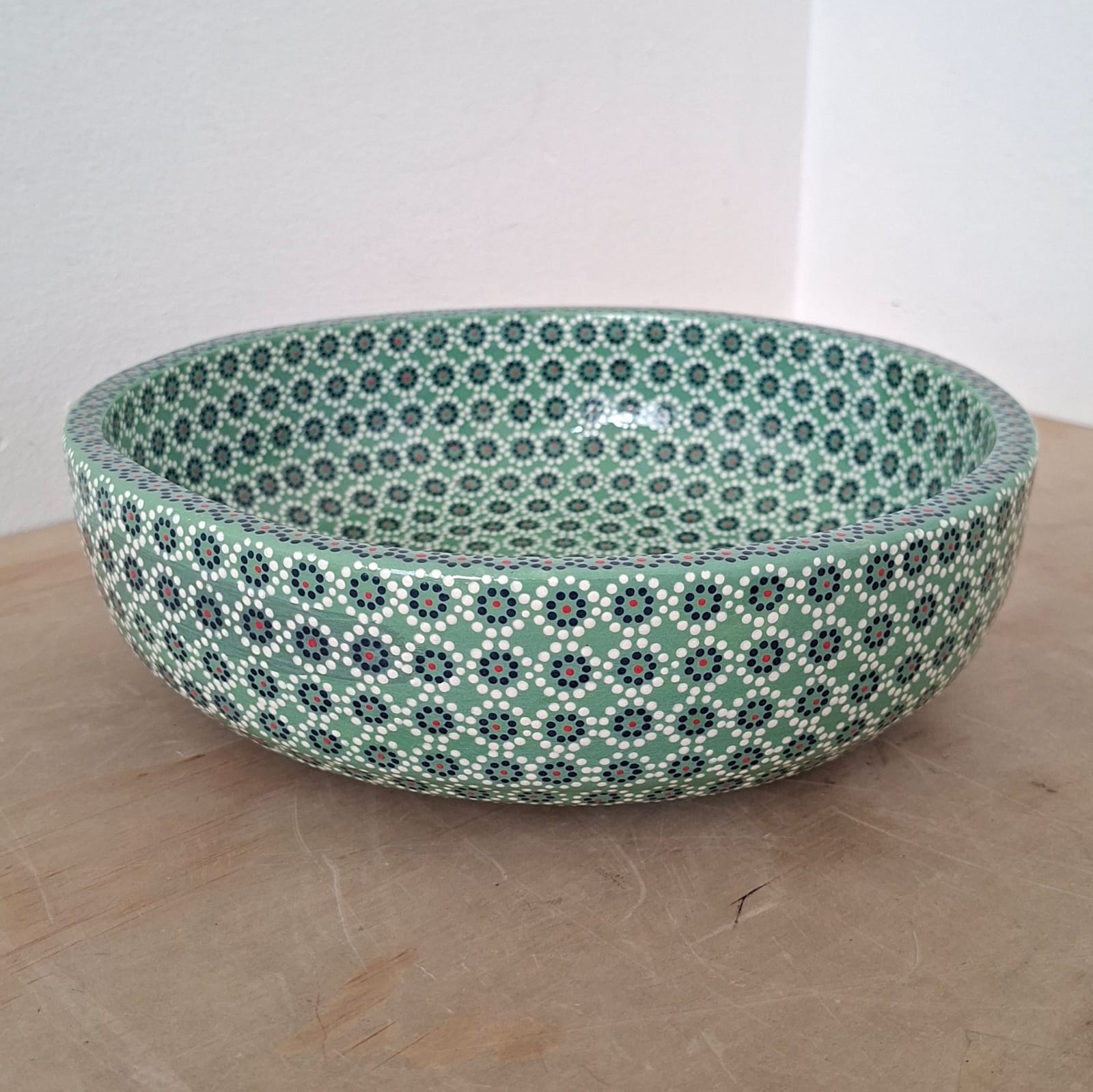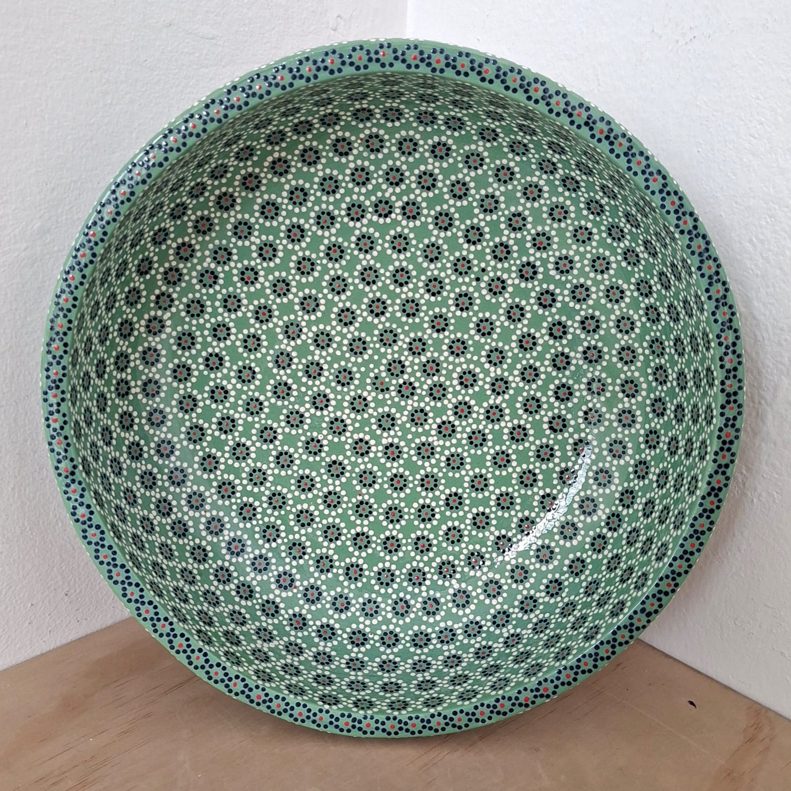 Ensaladera o frutero originaria de Capula, con el tramado característico de la zona. Fondo de color sólido con sellos florales al rededor. Toda esmaltada y elaborada en barro. Ideal para ensaladas o fruta picada. Medidas: Diámetro: 24 cms, Alto 7 cms. Capacidad: 2.4 l. Pieza libre de plomo.