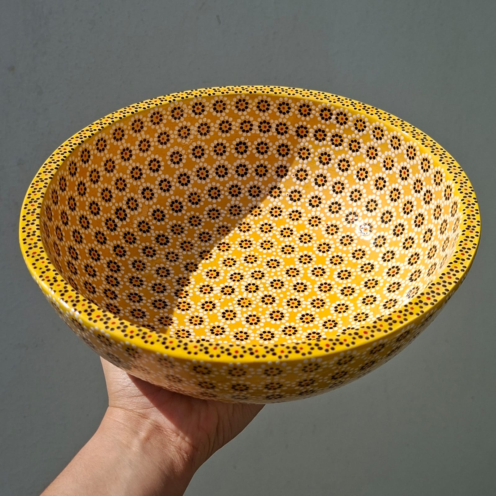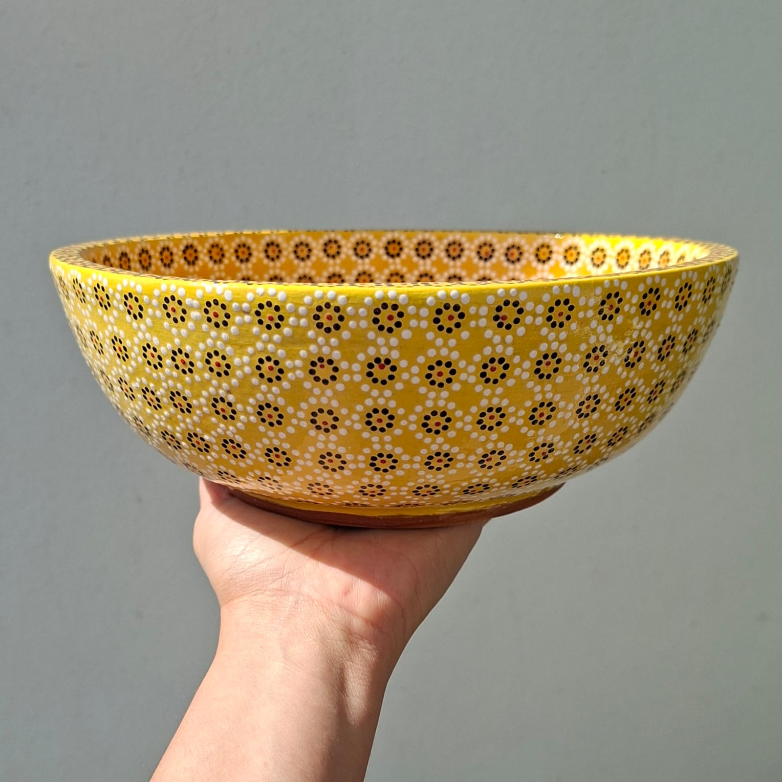 Ensaladera o frutero originaria de Capula, con el tramado característico de la zona. Fondo de color sólido con sellos florales al rededor. Toda esmaltada y elaborada en barro. Ideal para ensaladas o fruta picada. Medidas: Diámetro: 22.5 cms, Alto 8 cms. Capacidad: 1.3 l. Pieza libre de plomo.
