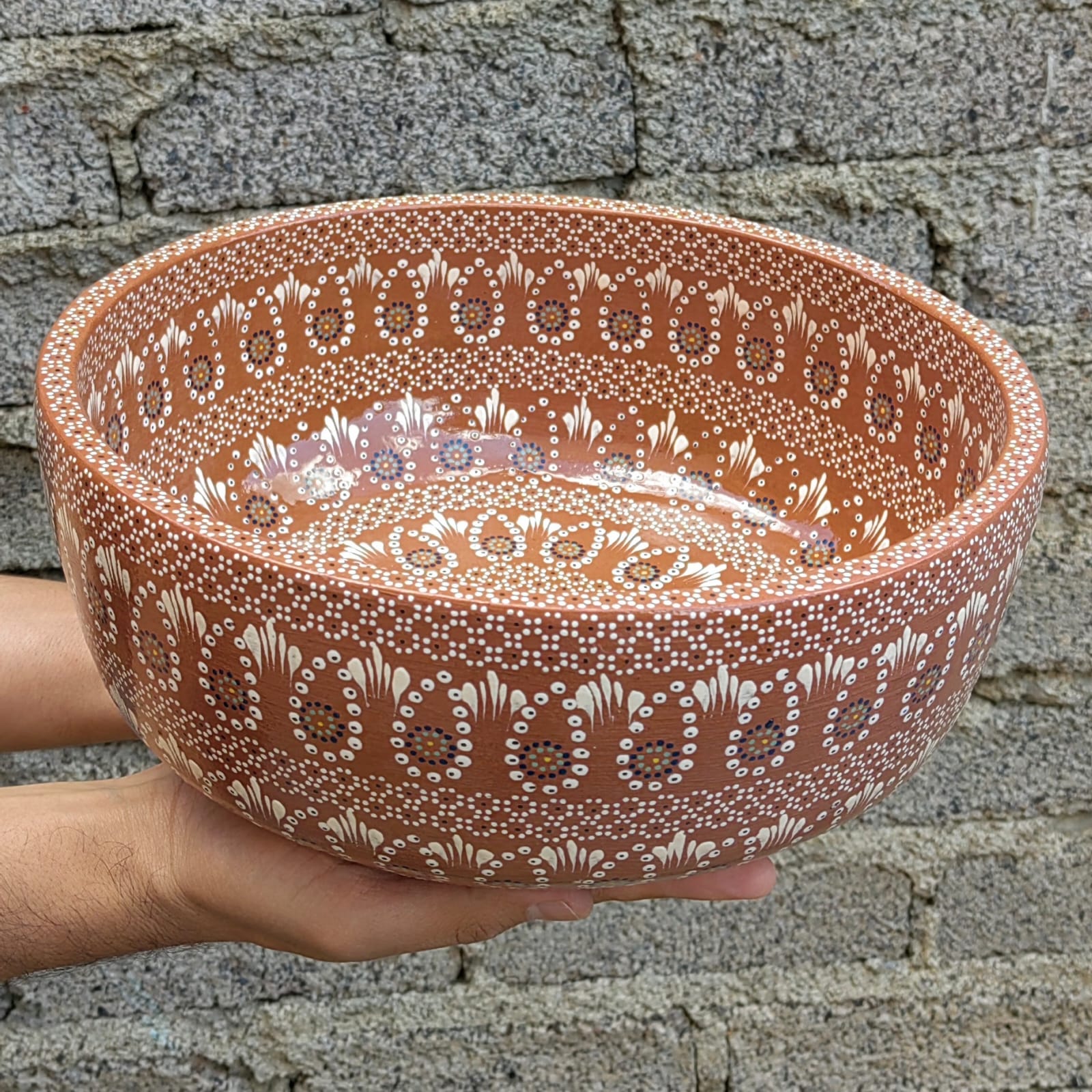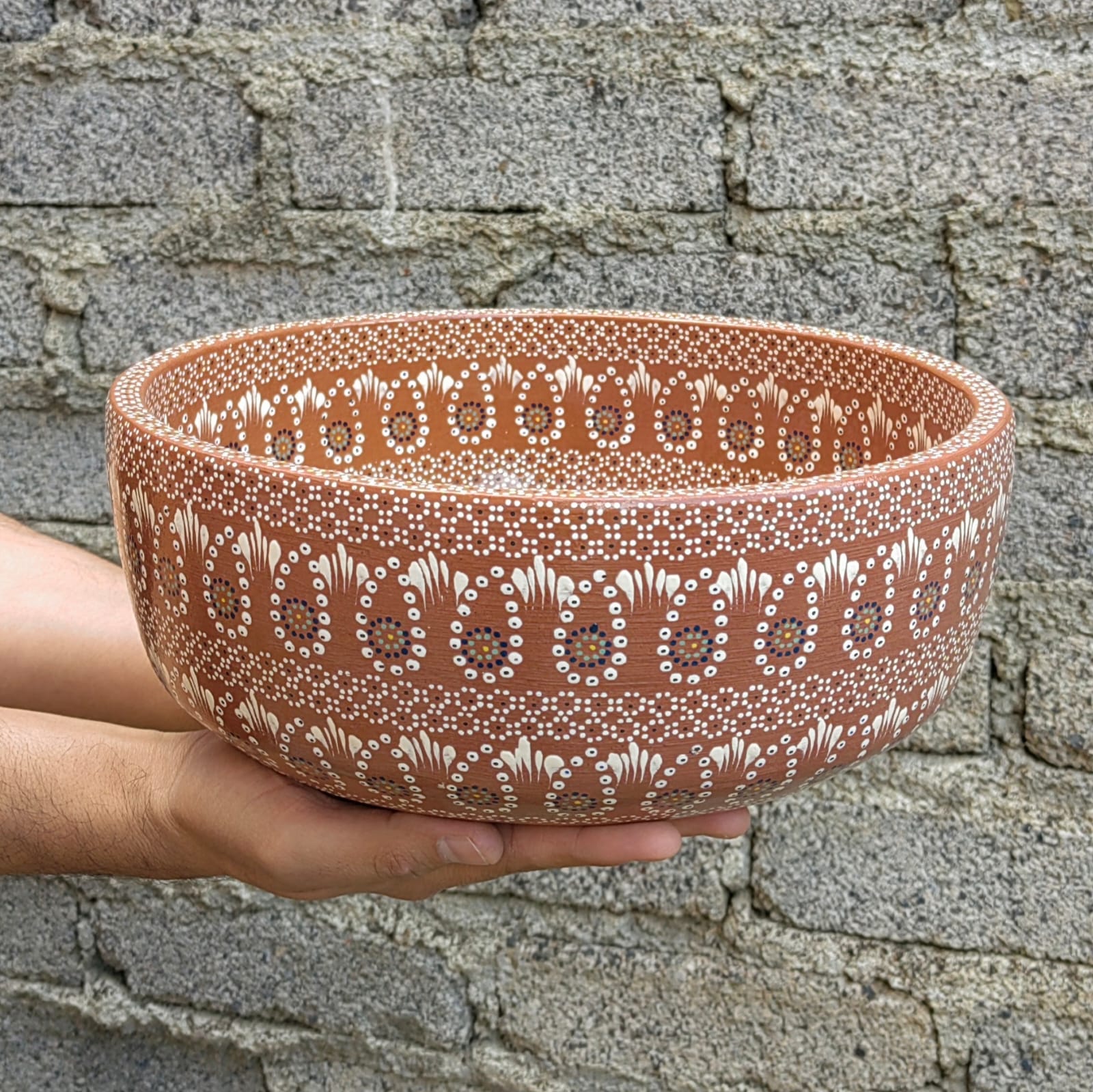Ensaladera o frutero originaria de Capula, con el tramado característico de la zona. Fondo de color sólido con sellos florales al rededor. Toda esmaltada y elaborada en barro. Ideal para ensaladas o contenedor de fruta. Medidas: Diámetro: 28.5 cms, Alto 11 cms. Pieza libre de plomo.