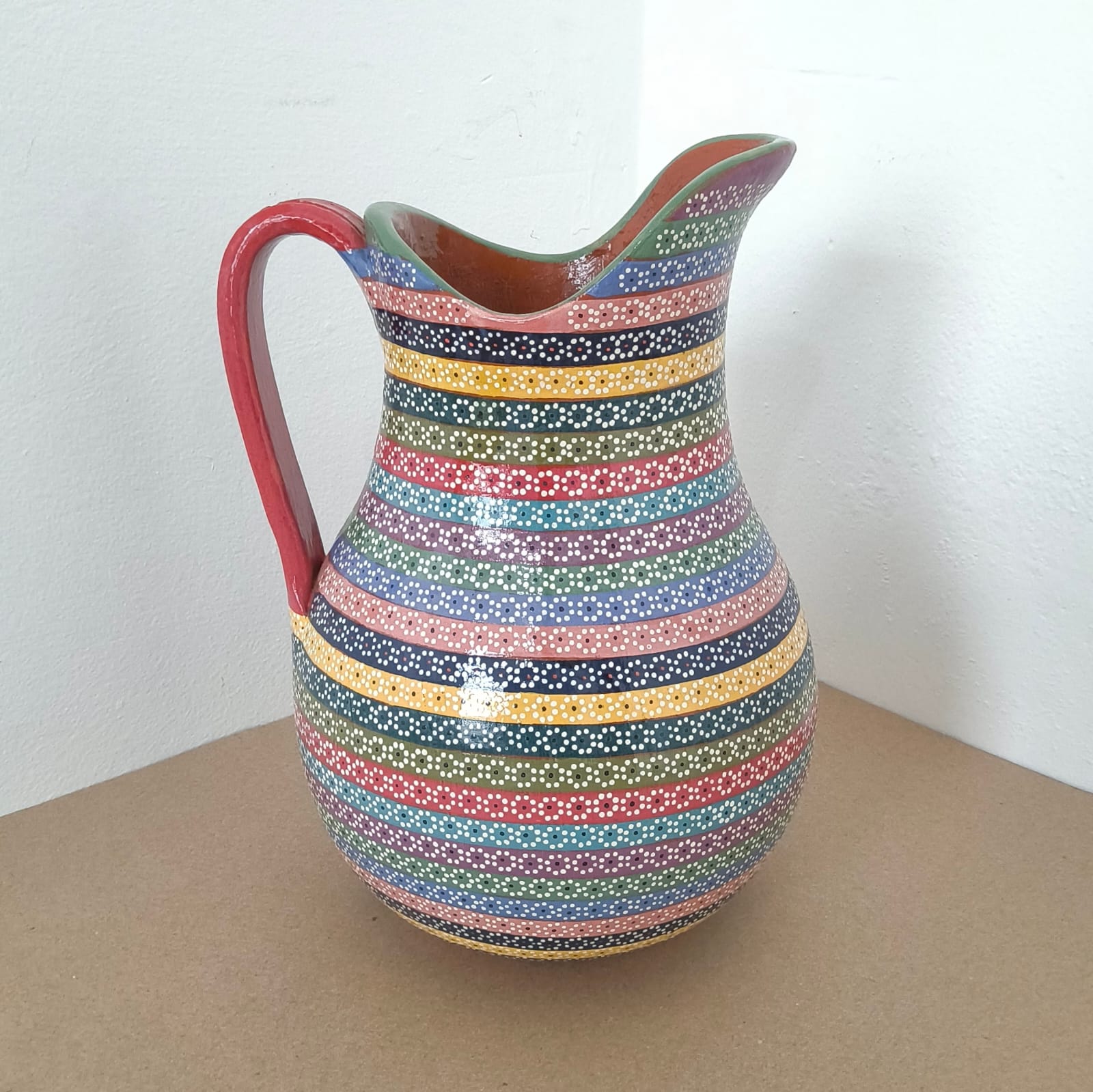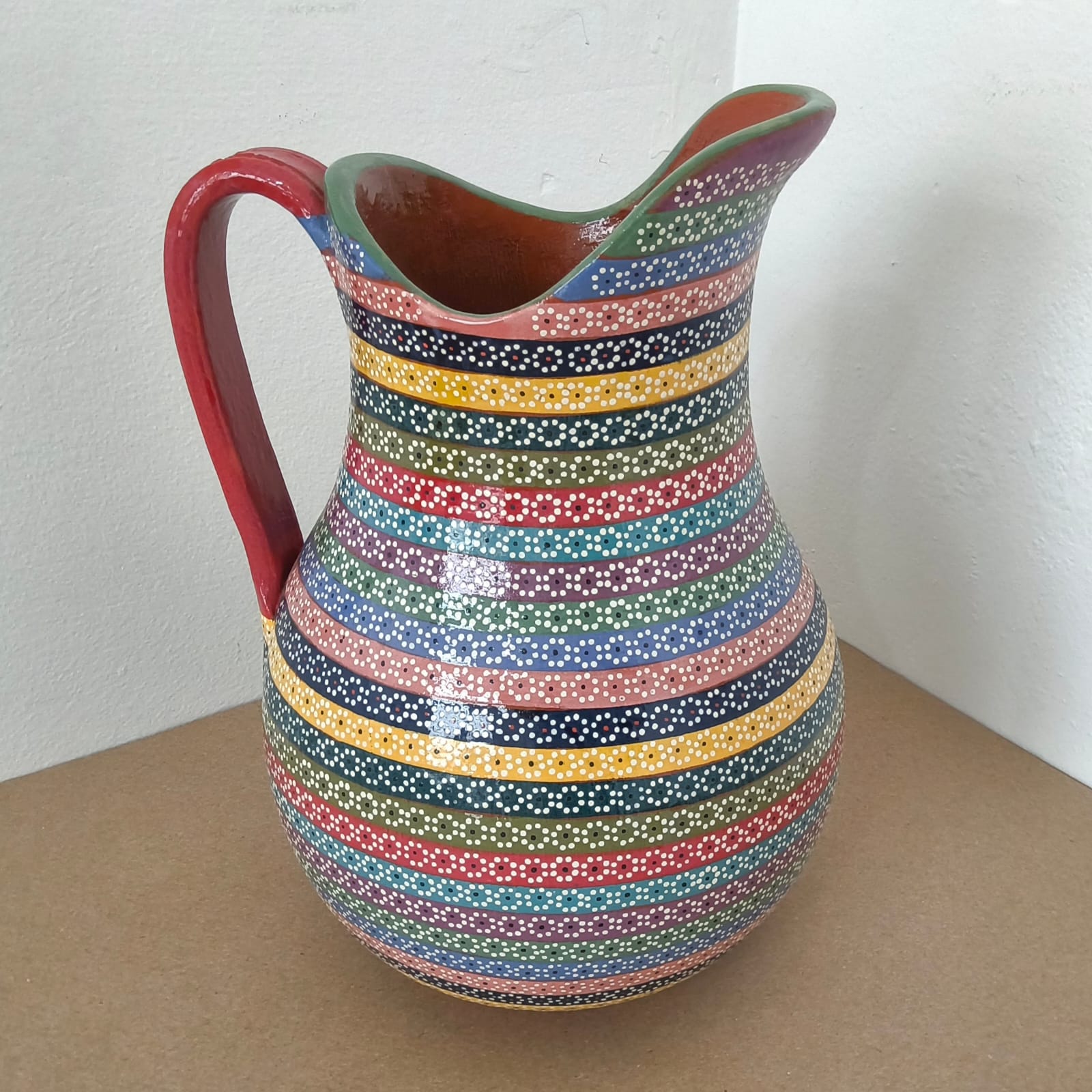 Jarra originaria de Capula, con el tramado característico de la zona. Fondo de color sólido con sellos florales al rededor. Toda esmaltada y elaborada en barro. Medidas: Largo: 19 cms, Ancho: 19, Alto: 28 cms. Pieza libre de plomo.