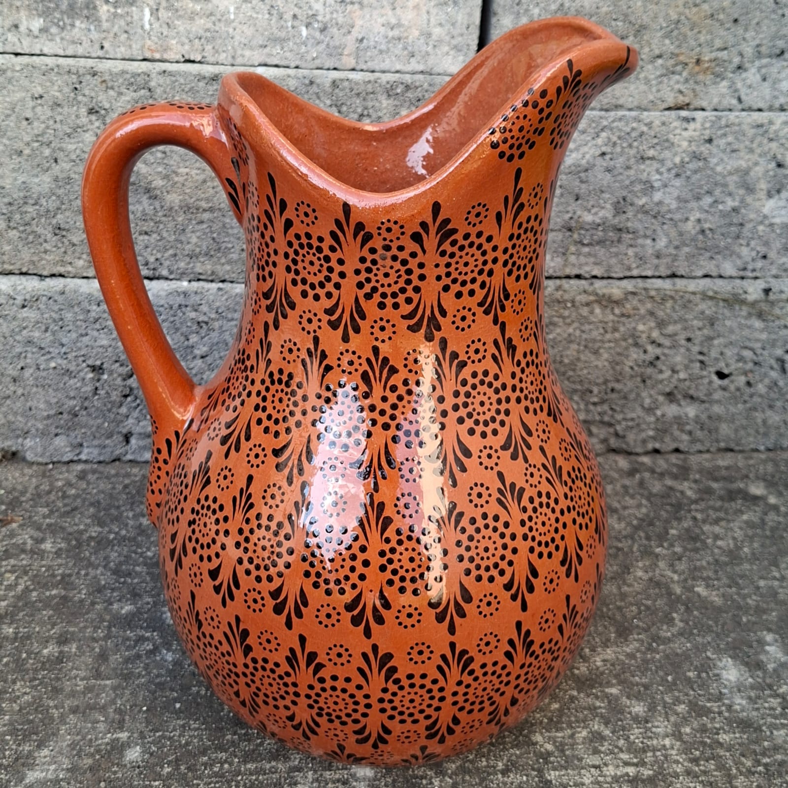 | Jarra originaria de Capula, con el tramado característico de la zona. Fondo de color sólido con sellos florales al rededor. Toda esmaltada y elaborada en barro. Medidas: Largo: 19 cms, Ancho: 19, Alto: 28 cms. Pieza libre de plomo. |