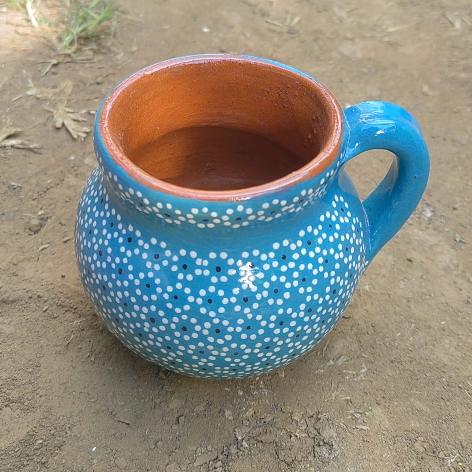 Tarro originaria de Capula, con el tramado característico de la zona. Fondo de color sólido con sellos florales al rededor. Toda esmaltada y elaborada en barro. Ideal para café o té. Soporta altas temperaturas. Se puede meter al horno de microondas. Pieza libre de plomo.