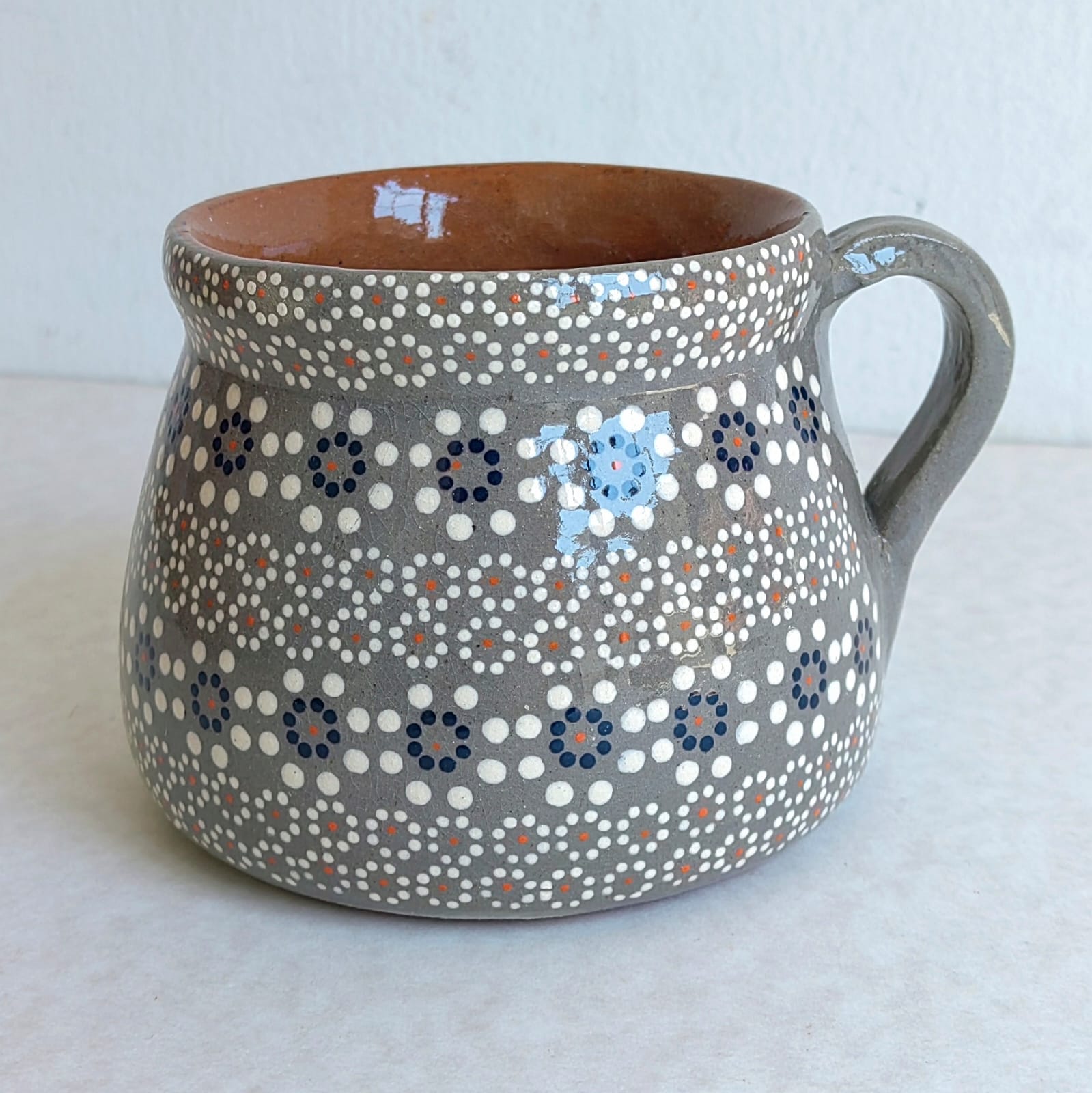 Tarro chocolatero originario de Capula, con el tramado característico de la zona. Fondo de color sólido con sellos florales al rededor. Toda esmaltada y elaborada en barro. Ideal para chocolate caliente, café o té. Soporta altas temperaturas. Se puede meter al horno de microondas. Pieza libre de plomo.