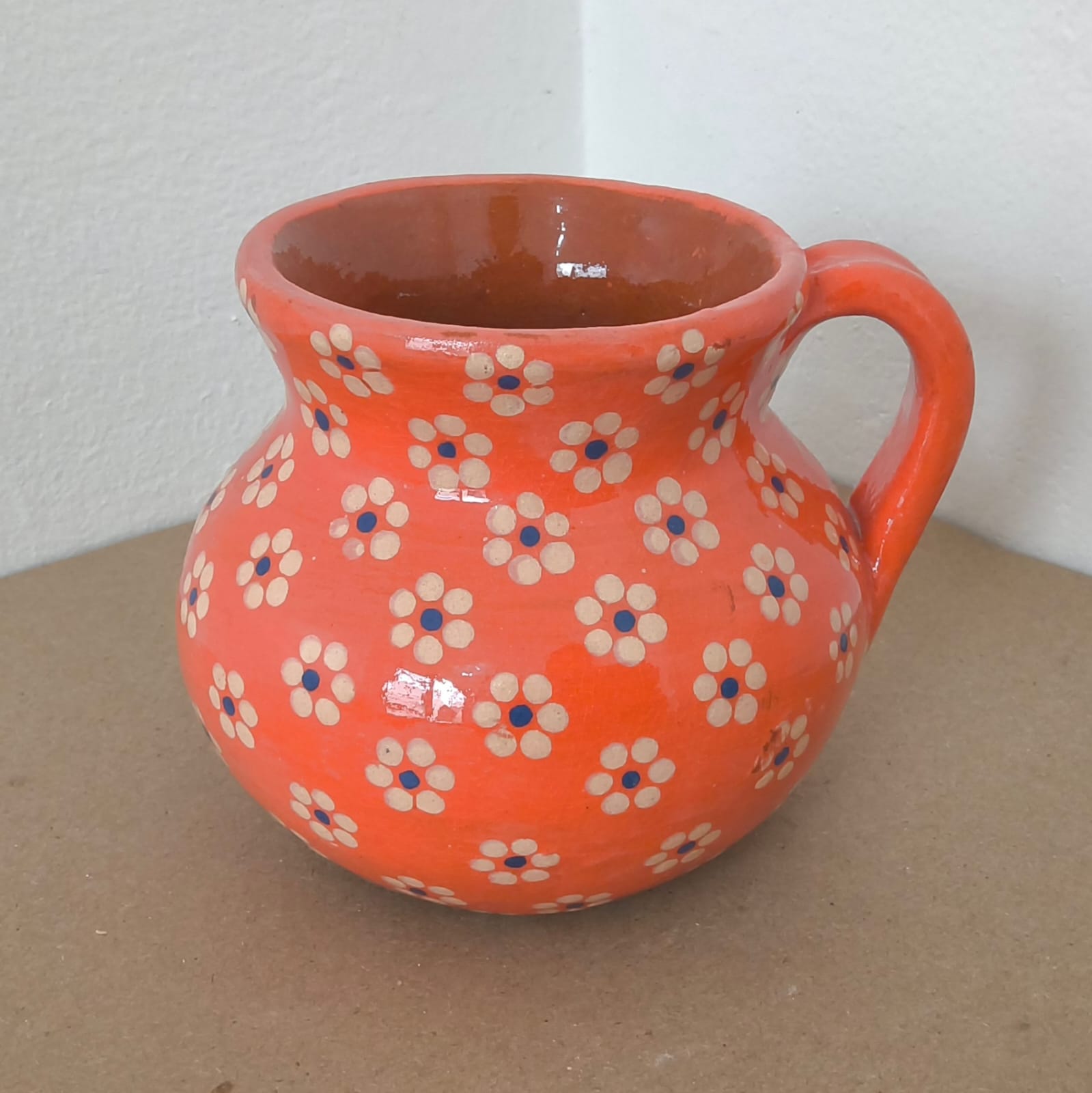 Tarro originaria de Capula, con el tramado característico de la zona. Fondo de color sólido con sellos florales al rededor. Toda esmaltada y elaborada en barro. Ideal para café o té. Soporta altas temperaturas. Se puede meter al horno de microondas. Pieza libre de plomo.