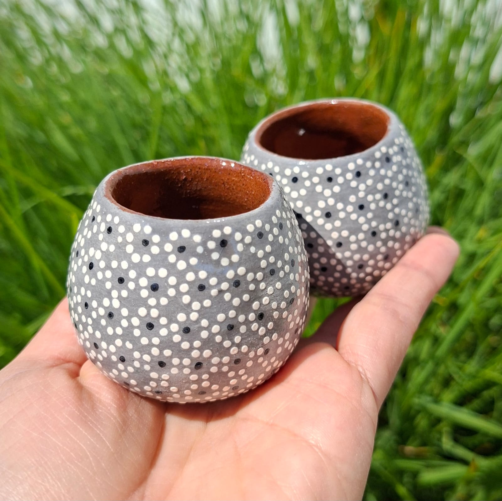 Kit de 2 mezcaleros originarios de Capula, con el tramado característico de la zona. Fondo de color sólido con sellos florales al rededor. Todos esmaltados y elaborados en barro. Ideal para tequila o mezcal. Capacidad por pieza: 50 ml. Pieza libre de plomo.