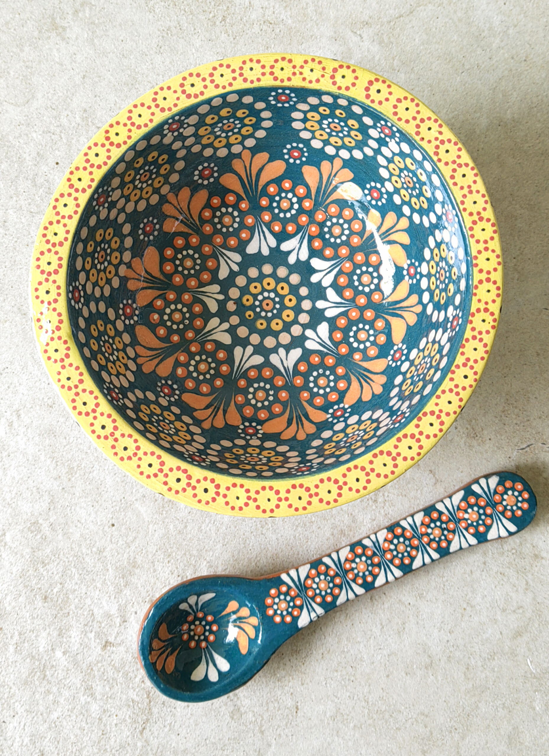 | Salsero en forma de molcajete originario de Capula, con el tramado característico de la zona. Fondo de color sólido con sellos florales al rededor. Todo esmaltado y elaborado en barro. Ideal para sal, limón y chile. Medidas: Diámetro: 15 cms., Altura: 7.5 cms. Incluye cucharita. Pieza libre de plomo. |