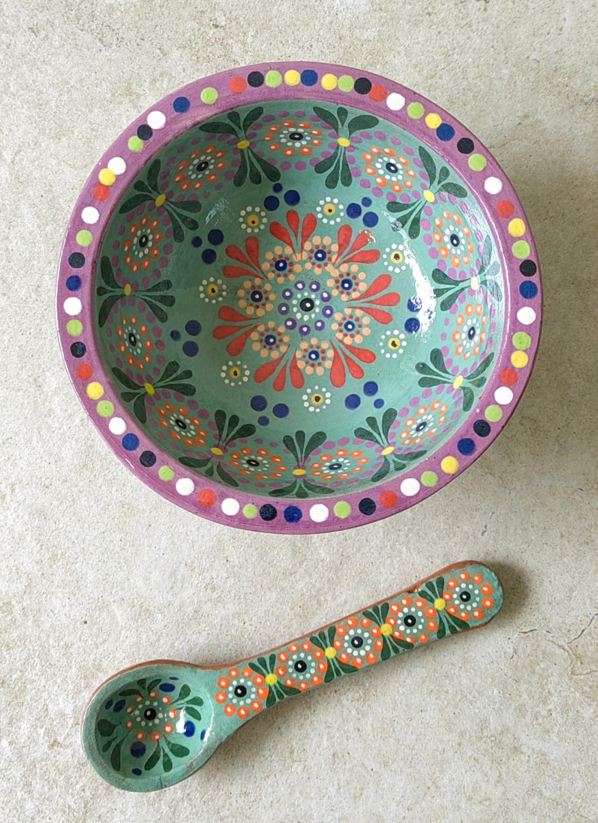 Salsero en forma de molcajete originario de Capula, con el tramado característico de la zona. Fondo de color sólido con sellos florales al rededor. Todo esmaltado y elaborado en barro. Ideal para sal, limón y chile. Medidas: Diámetro: 15 cms., Altura: 7.5 cms.  Incluye cucharita. Pieza libre de plomo.