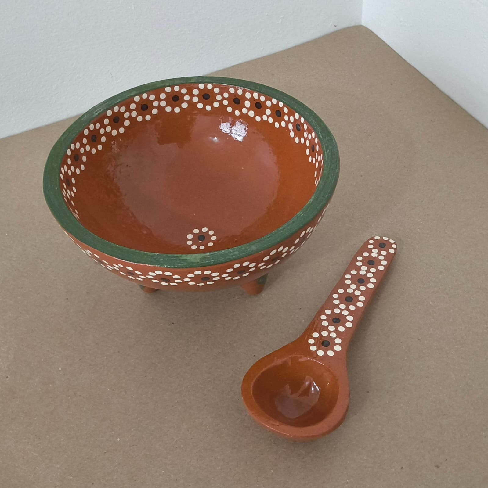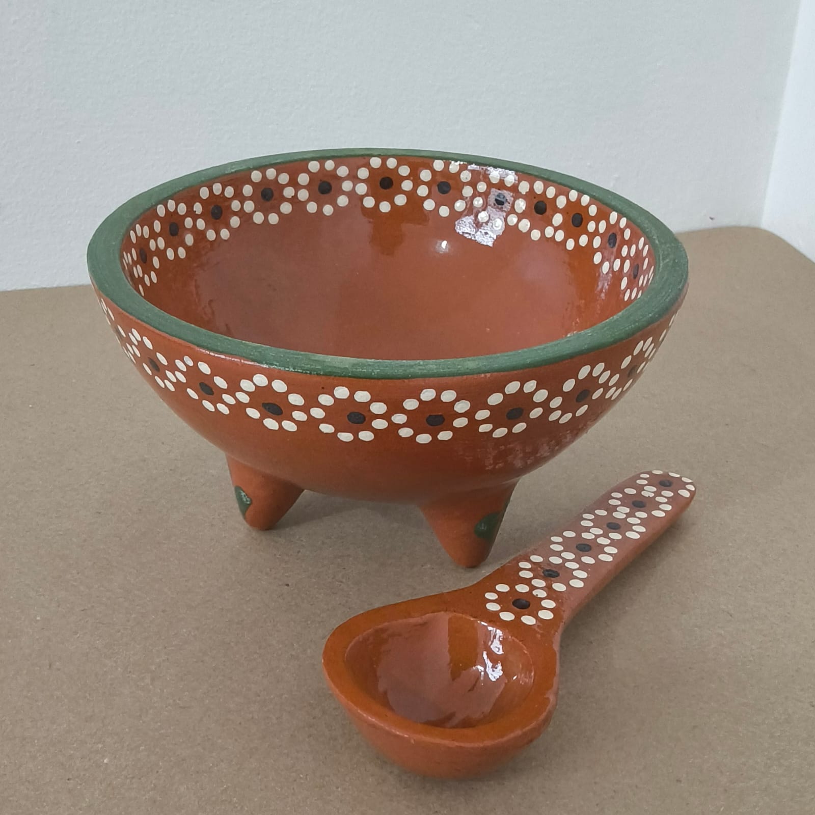 | Salsero en forma de molcajete originario de Capula, con el tramado característico de la zona. Fondo de color sólido con sellos florales al rededor. Todo esmaltado y elaborado en barro. Ideal para salsas o botanas. Medidas: Diámetro: 17.5 cms., Altura: 9.5 cms. Capacidad: 600 ml. Pieza libre de plomo. |