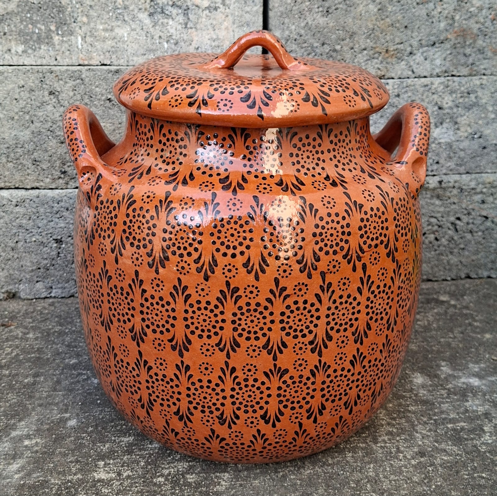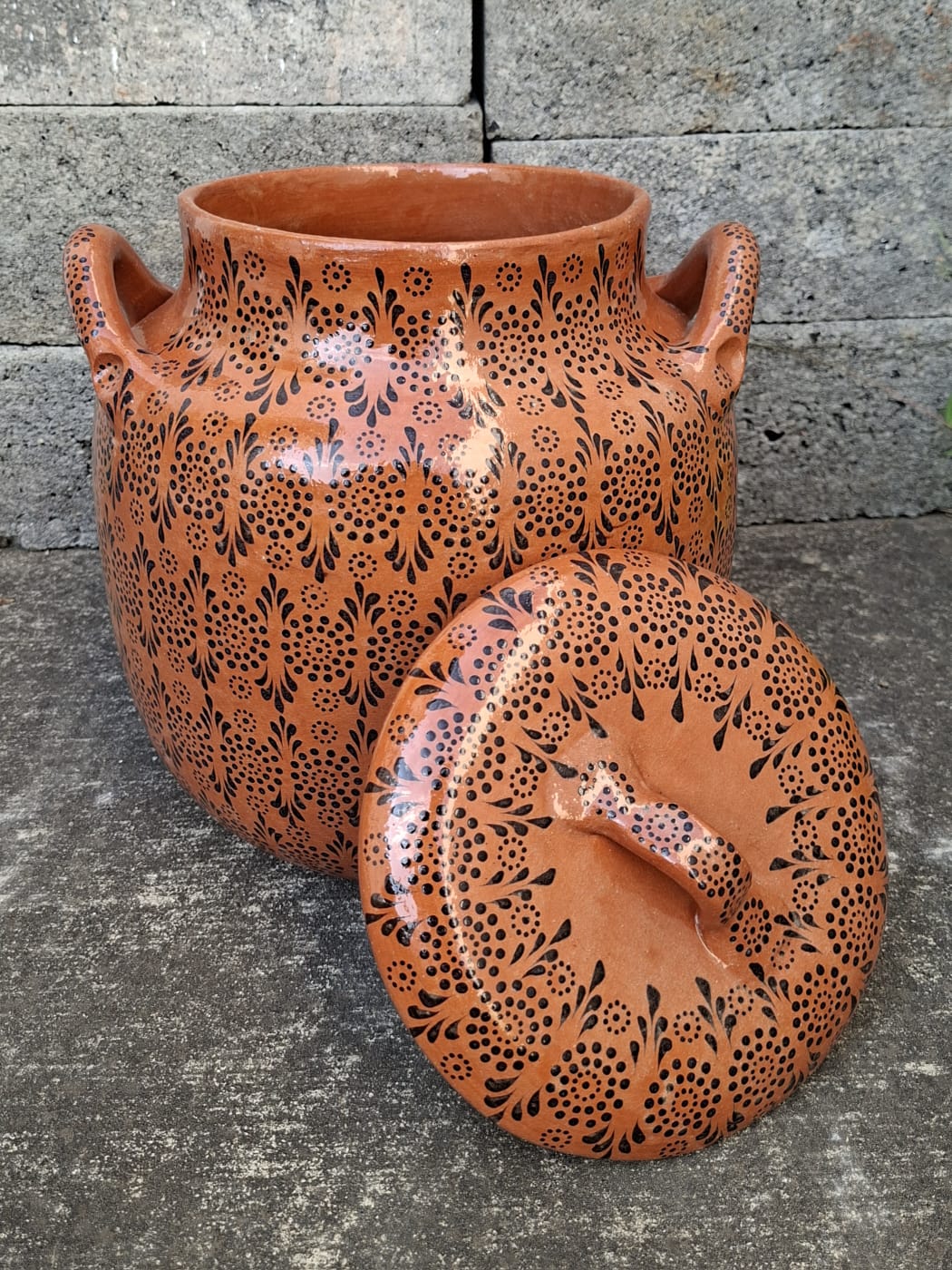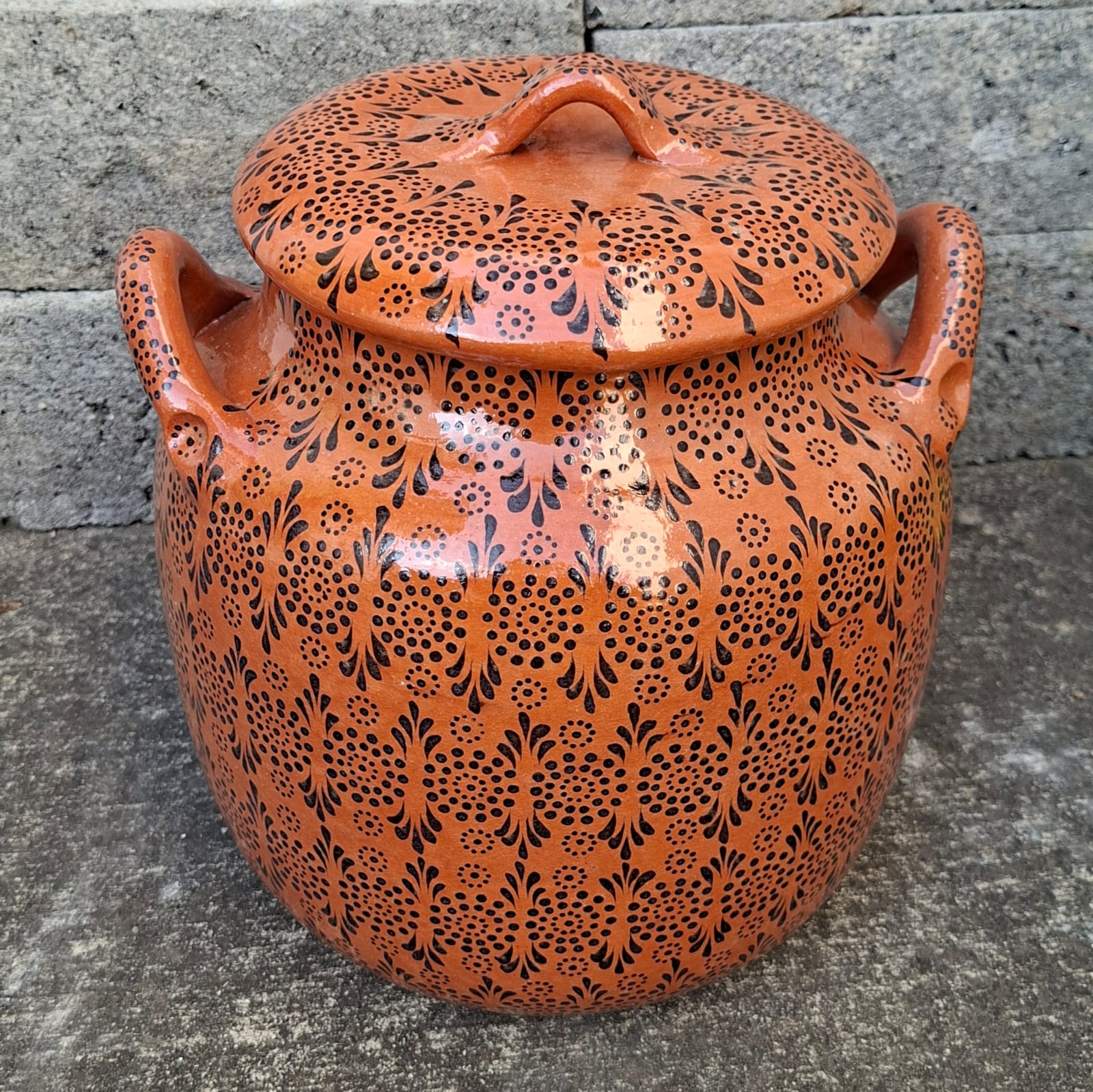 | Olla originaria de Capula, con el tramado característico de la zona. Fondo de color sólido con sellos florales al rededor. Toda esmaltada y elaborada en barro. Ideal para frijoles o atole. Se puede colocar a fuego directo. Incluye 2 piezas. Medidas: Largo de asa a asa: 26 cms, Diámetro: 26 cms., Altura: 29 cms. Capacidad: 9 litros. Pieza libre de plomo. |