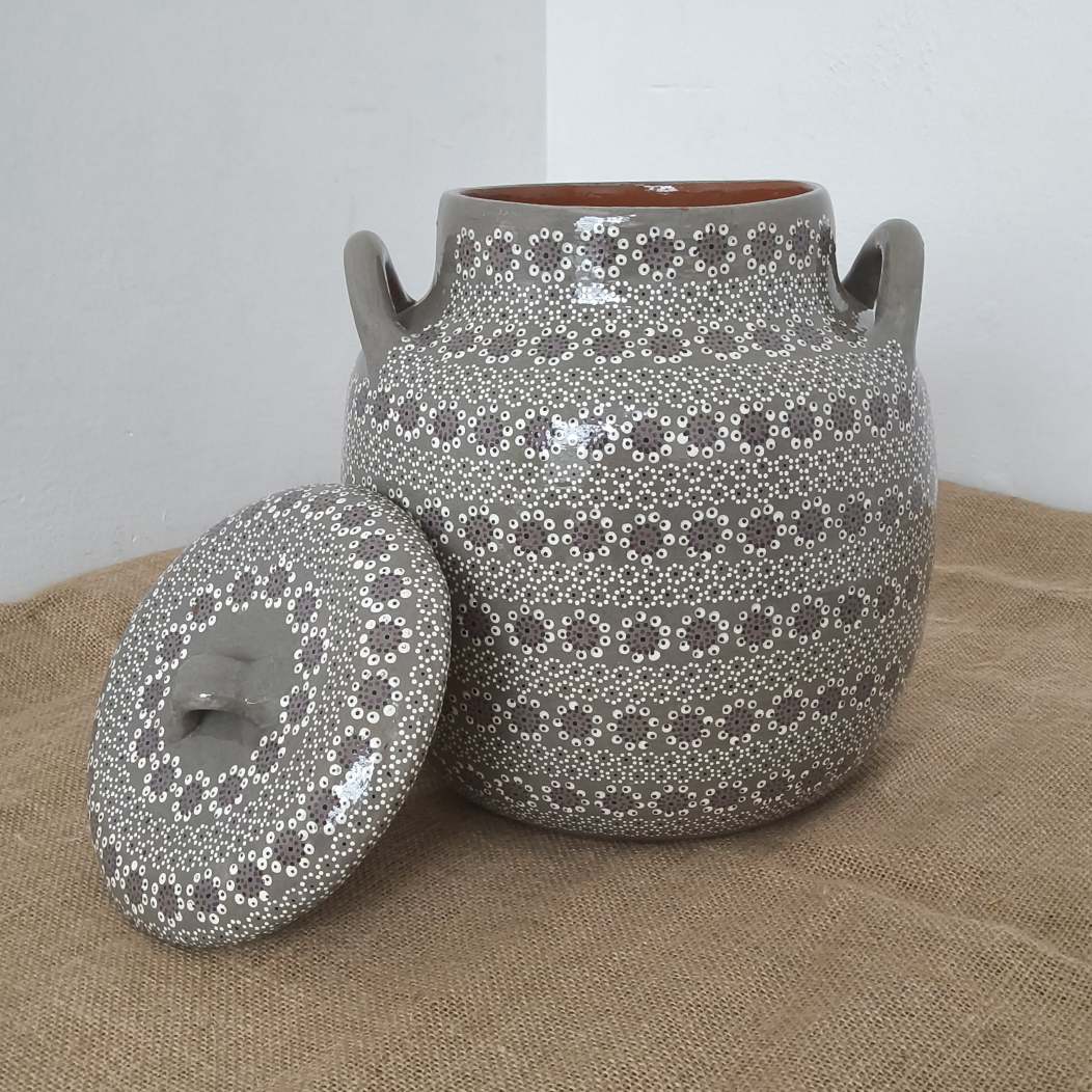 Olla originaria de Capula, con el tramado característico de la zona. Fondo de color sólido con sellos florales al rededor. Toda esmaltada y elaborada en barro. Ideal para frijoles o atole. Se puede colocar a fuego directo. Incluye 2 piezas. Medidas: Largo de asa a asa: 26 cms, Diámetro: 26 cms., Altura: 29 cms. Capacidad: 9 litros. Pieza libre de plomo.