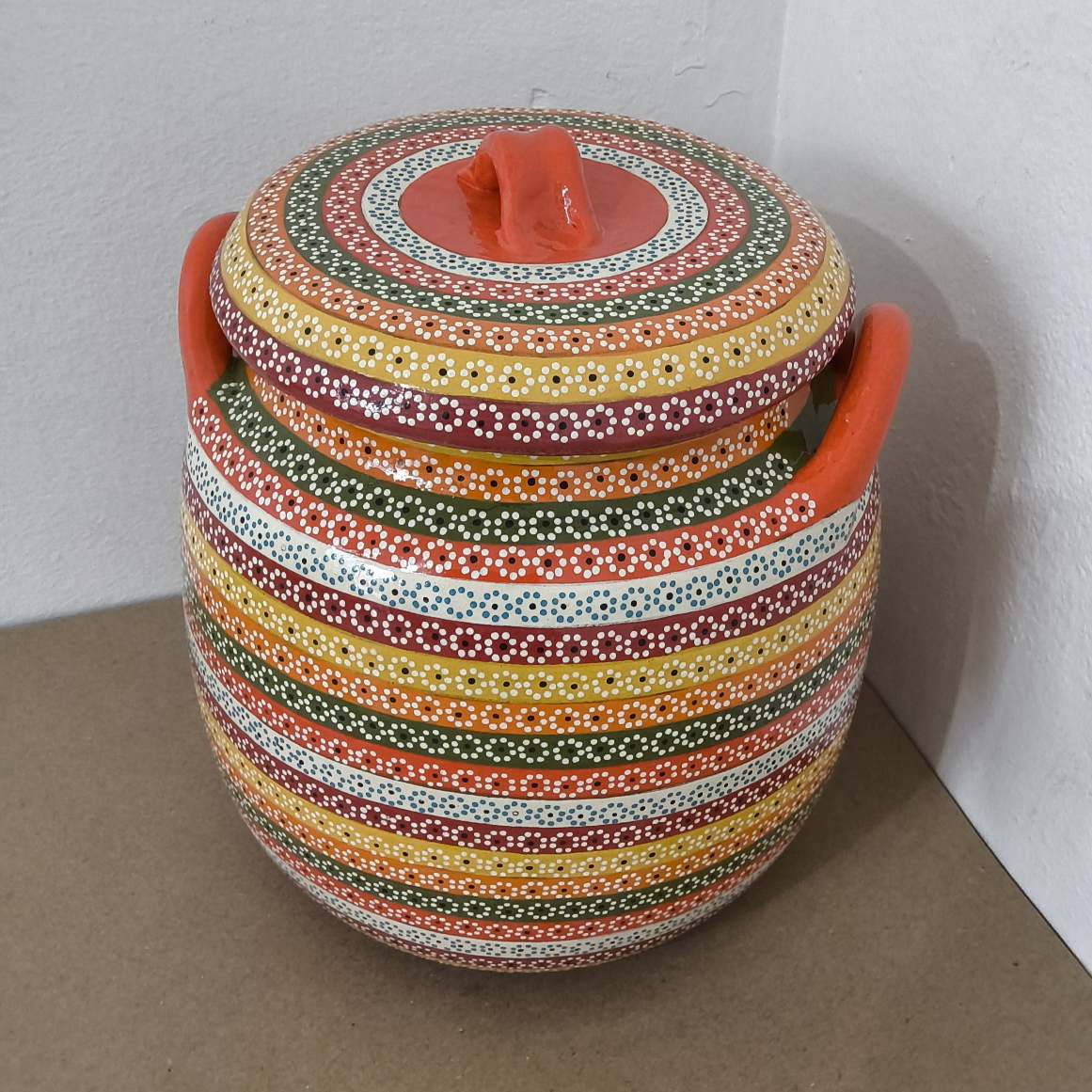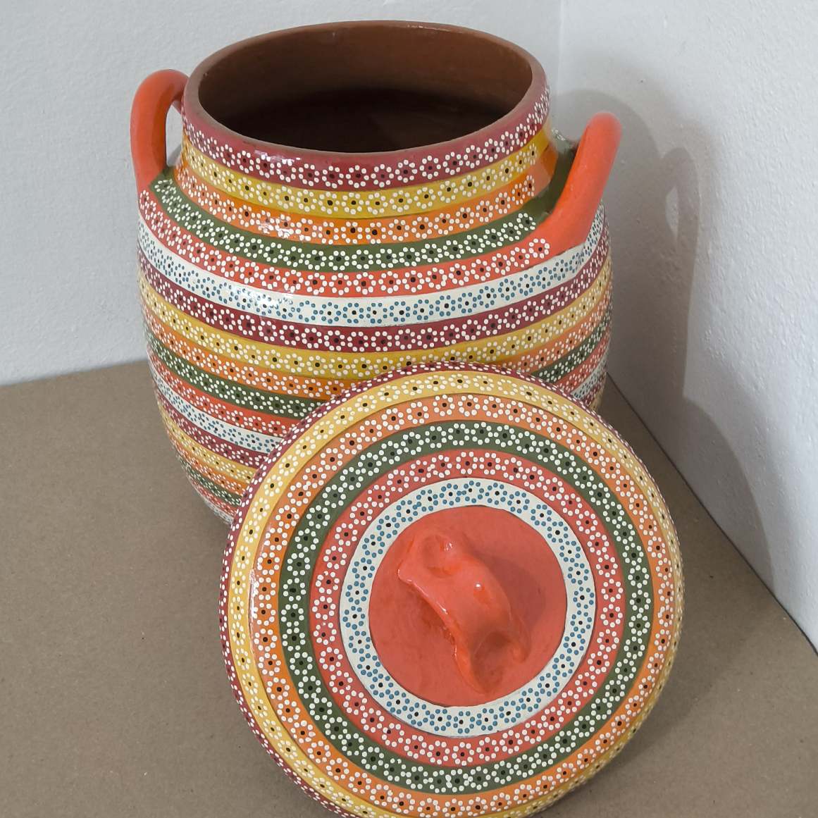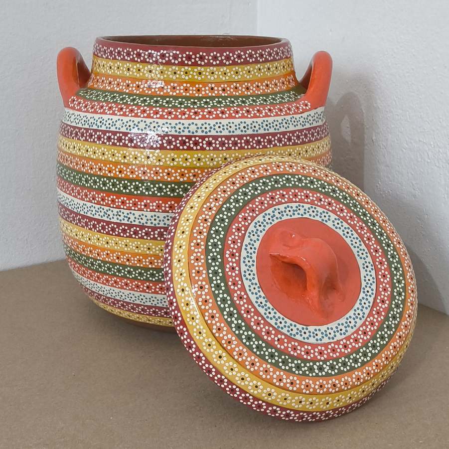 Olla originaria de Capula, con el tramado característico de la zona. Fondo de color sólido con sellos florales al rededor. Toda esmaltada y elaborada en barro. Ideal para frijoles o atole. Se puede colocar a fuego directo. Incluye 2 piezas. Medidas: Largo de asa a asa: 22.5 cms, Diámetro: 21 cms., Altura: 24 cms. Capacidad: 5.150 litros. Pieza libre de plomo.