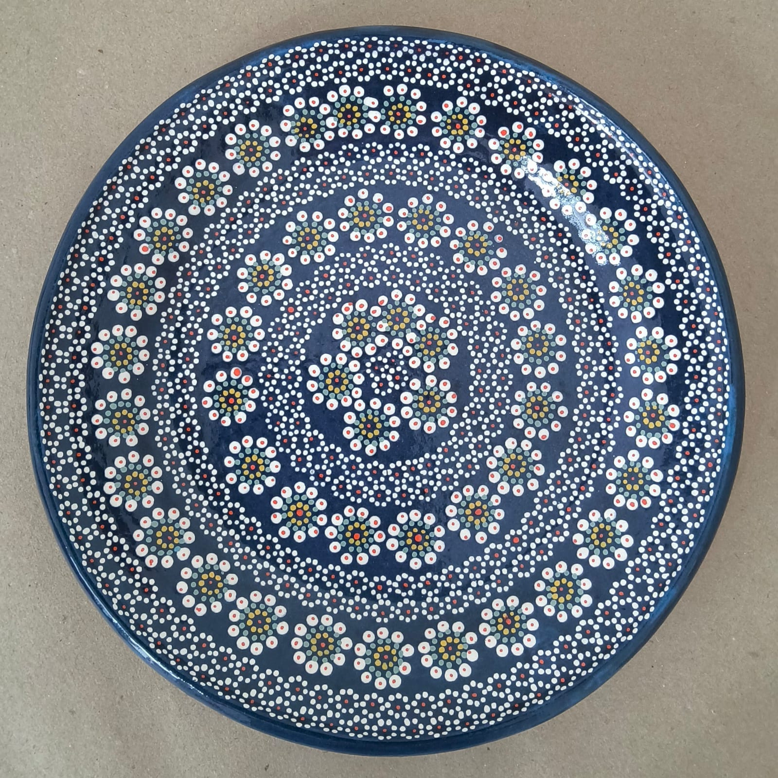 Plato originario de Capula, con el tramado característico de la zona. Fondo de color sólido con sellos florales al rededor. Todo esmaltado y elaborado en barro. Puede meter al horno de microondas. Ideal para entradas. Medidas: Diámetro: 23 cms., Altura: 3.3 cms. Pieza libre de plomo.
