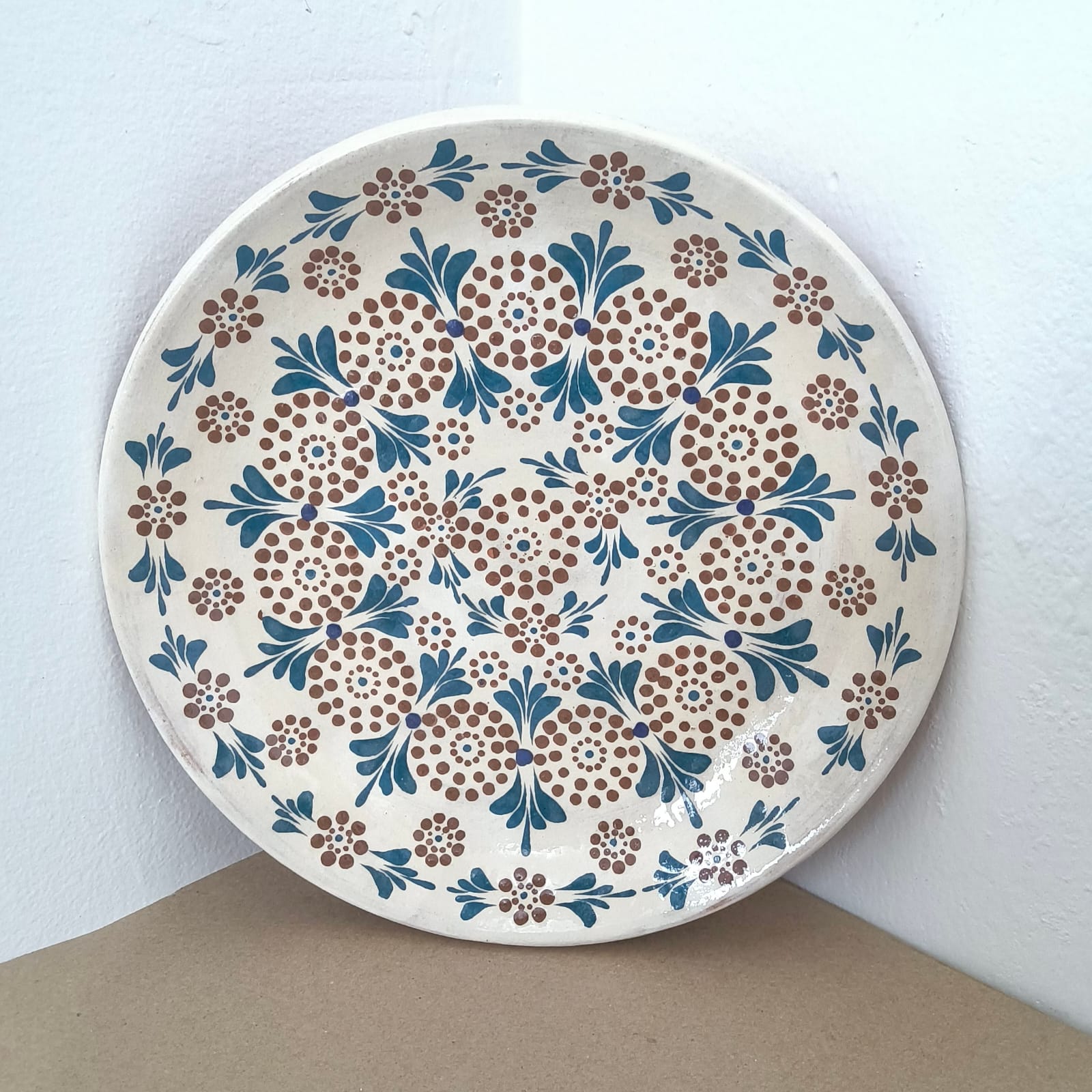 Plato originario de Capula, con el tramado característico de la zona. Fondo de color sólido con sellos florales al rededor. Todo esmaltado y elaborado en barro. Puede meter al horno de microondas. Ideal para entradas. Medidas: Diámetro: 23 cms., Altura: 3.3 cms. Pieza libre de plomo.