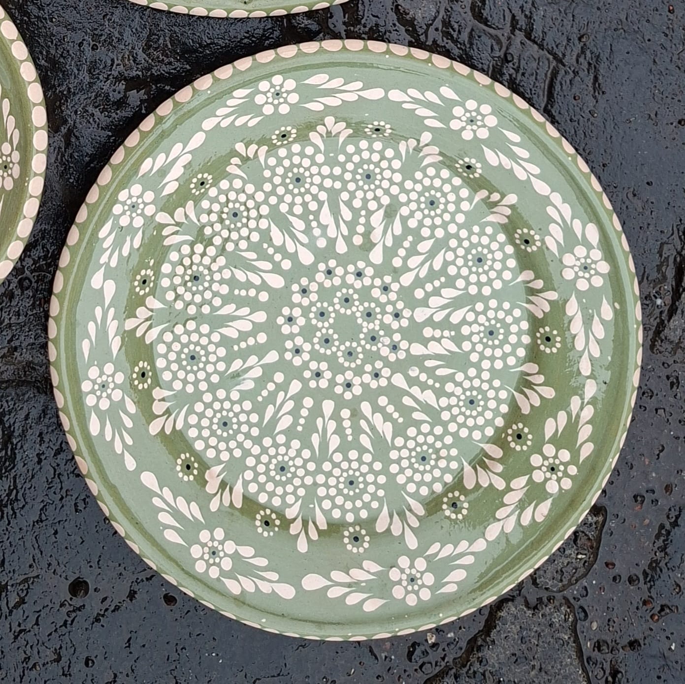 Plato originario de Capula, con el tramado característico de la zona. Fondo de color sólido con sellos florales al rededor. Todo esmaltado y elaborado en barro. Puede meter al horno de microondas. Ideal para entradas. Medidas: Diámetro: 23 cms., Altura: 3.3 cms. Pieza libre de plomo.