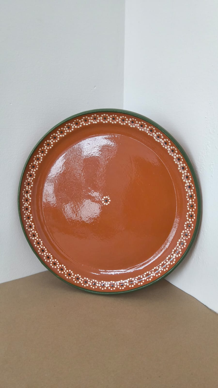 | Platón originario de Capula, con el tramado característico de la zona. Fondo de color sólido con sellos florales al rededor. Todo esmaltado y elaborado en barro. Ideal para centro de mesa o decoración. Medidas: Diámetro: 41 cms., Altura: 3.8 cms. Pieza libre de plomo. |