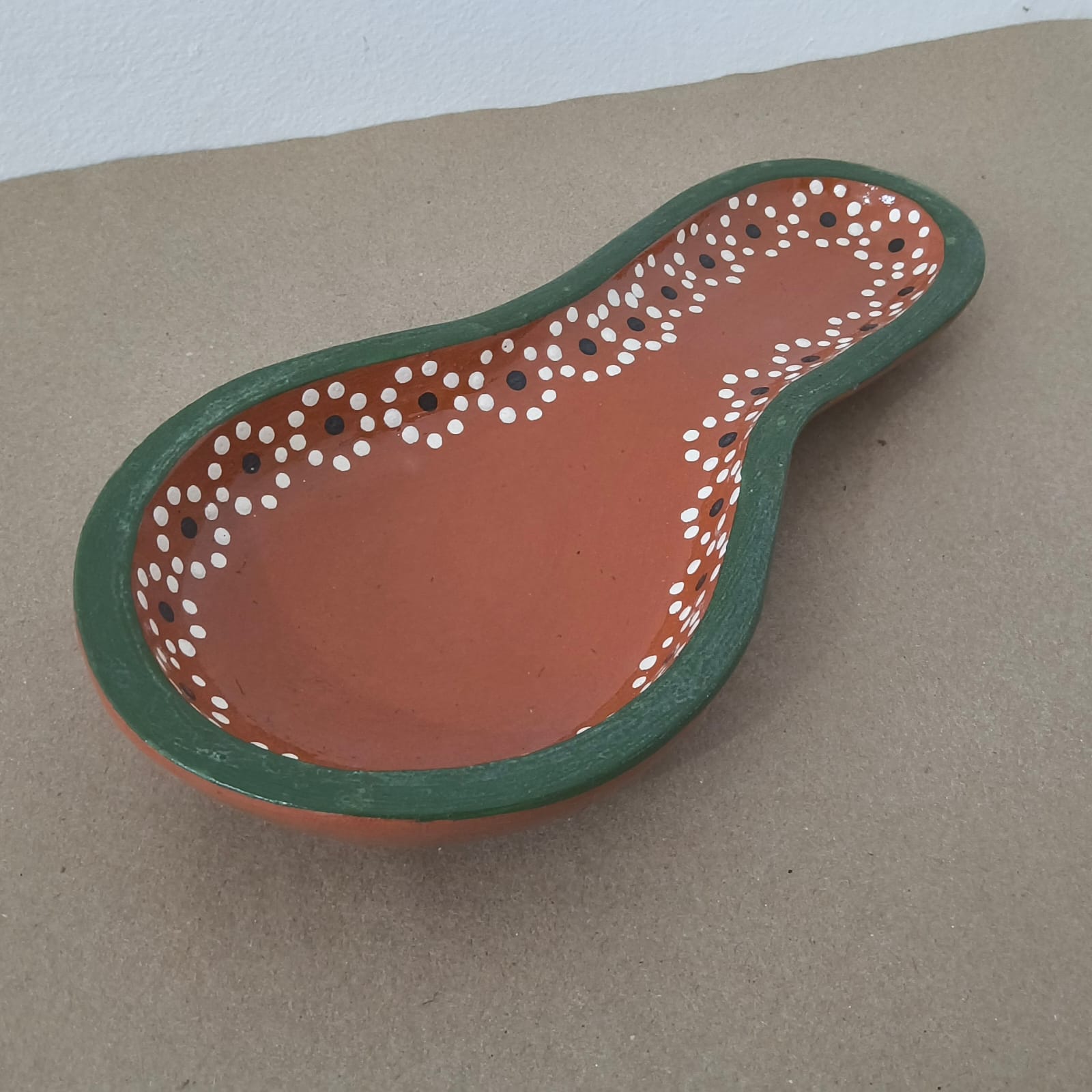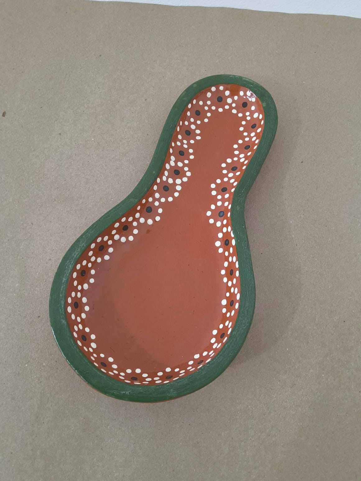 | Portacuchara originaria de Capula, con el tramado característico de la zona. Fondo de color sólido con sellos florales al rededor. Todo esmaltado y elaborado en barro. Ideal para colocar la cuchara. Medidas: Largo: 25.5 cms., Ancho: 12 cms. y Altura: 3 cms. Pieza libre de plomo. |
