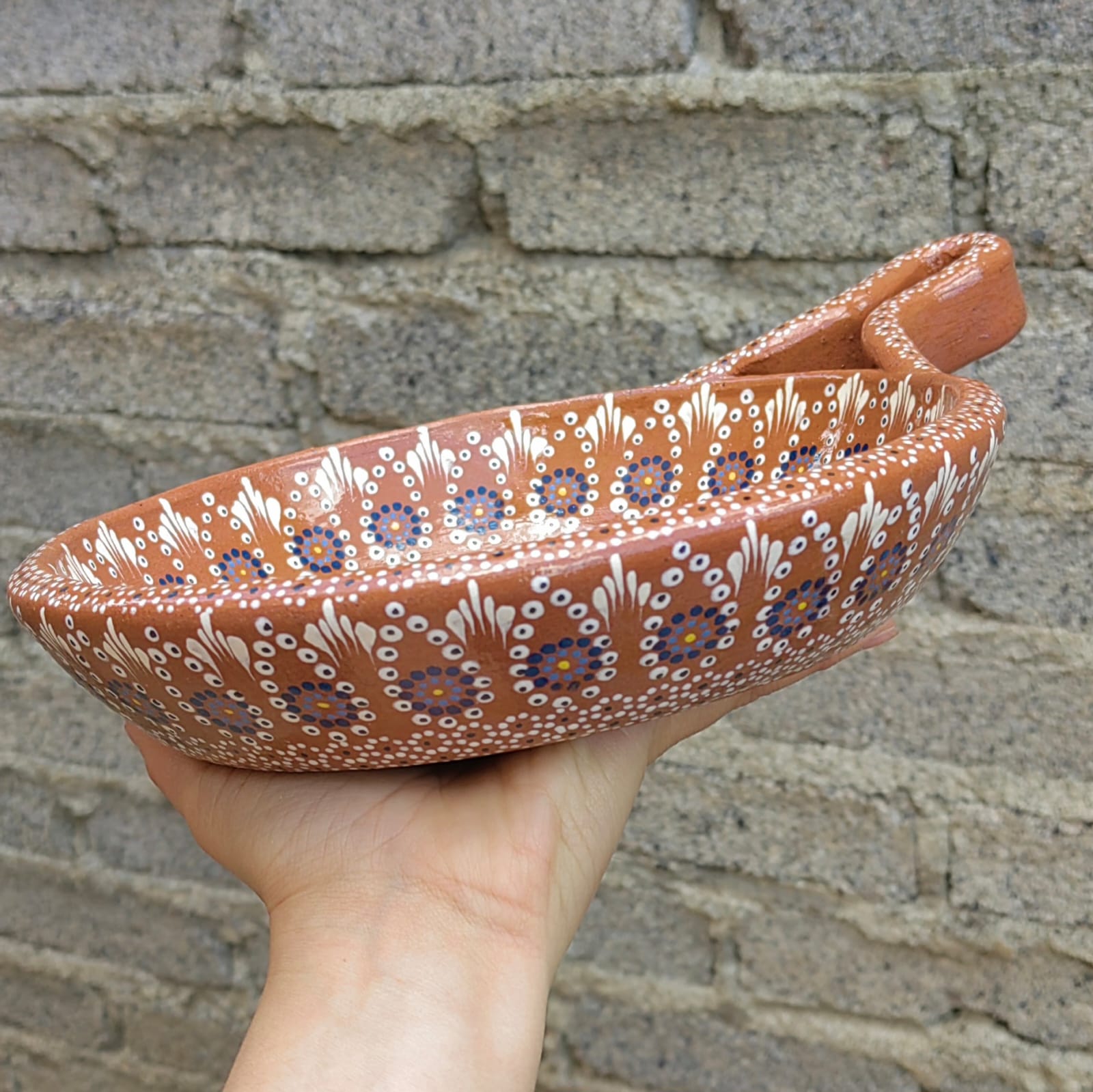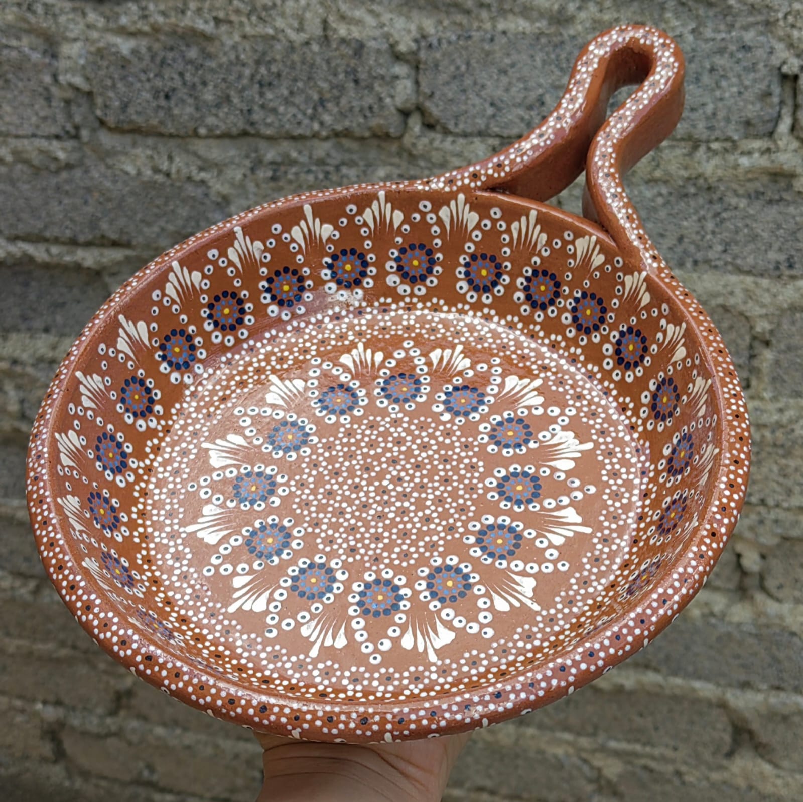 | Sartén originario de Capula, con el tramado característico de la zona. Fondo de color sólido con sellos florales al rededor. Todo esmaltado y elaborado en barro. Ideal para calentar guisados. Medidas: Largo: 35 cms, Diámetro: 27.5 cms., Alto: 9.5 cms. Pieza libre de plomo. |