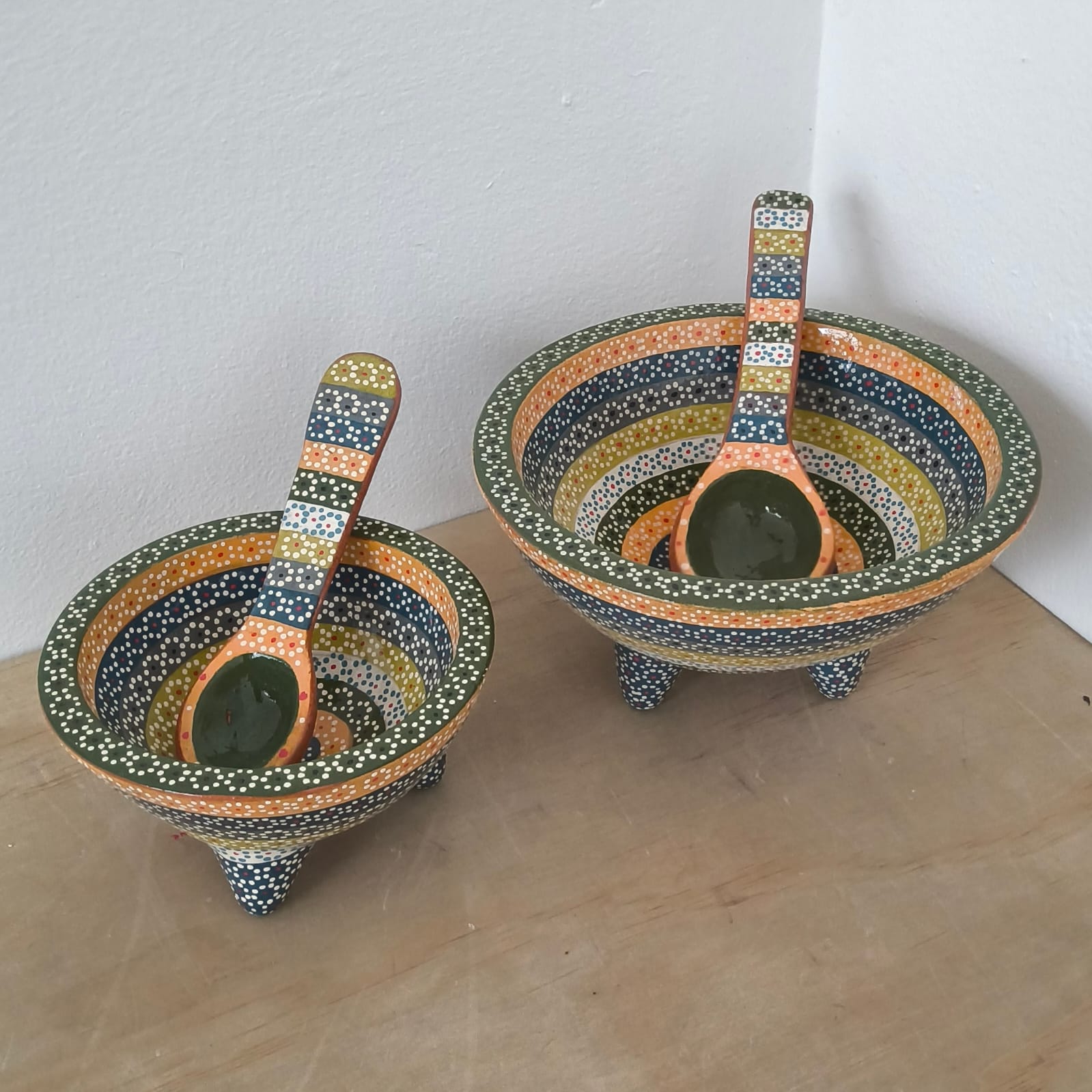 | Salseros/Fruteros/Recipientes en forma de molcajete originarios de Capula, con el tramado característico de la zona. Fondo de color sólido con sellos florales al rededor. Todo esmaltado y elaborado en barro. Incluyen cuchara. Pieza libre de plomo.