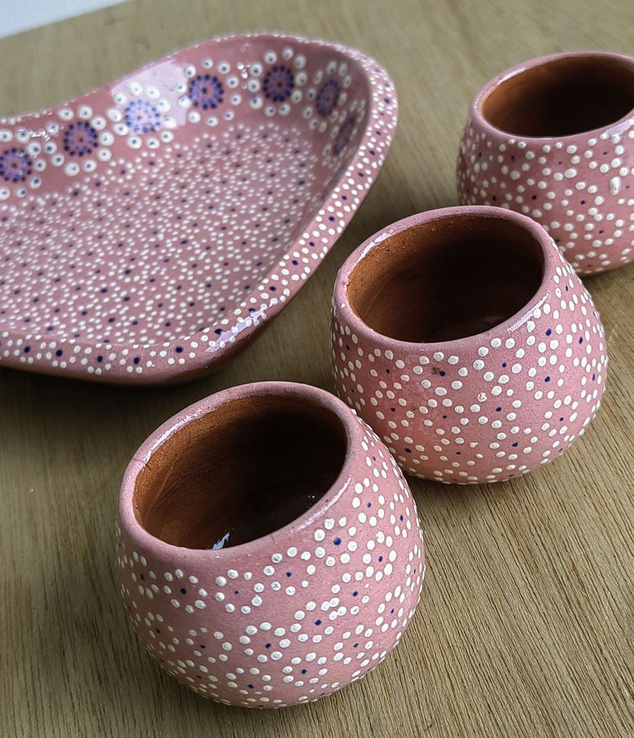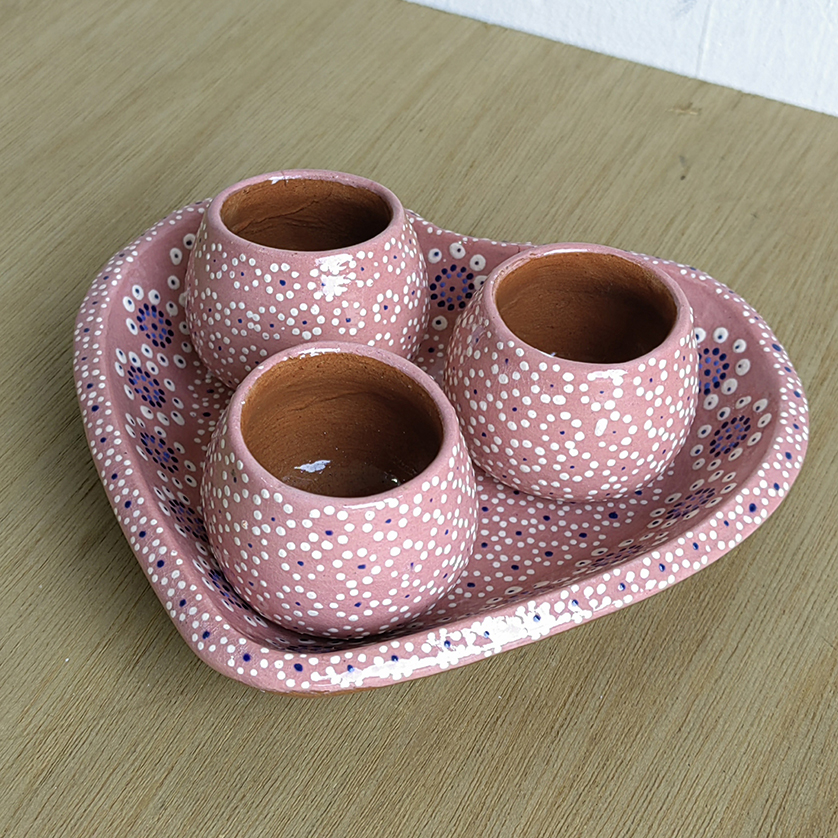 Set de 3 mezcaleros y 1 plato de corazón STD originarios de Capula, con el tramado característico de la zona. Fondo de color sólido con sellos florales al rededor. Todo esmaltado y elaborado en barro. Ideal para mezcal, botanas, sal y limón. Soporta altas temperaturas. Se puede meter al horno de microondas. Pieza libre de plomo.