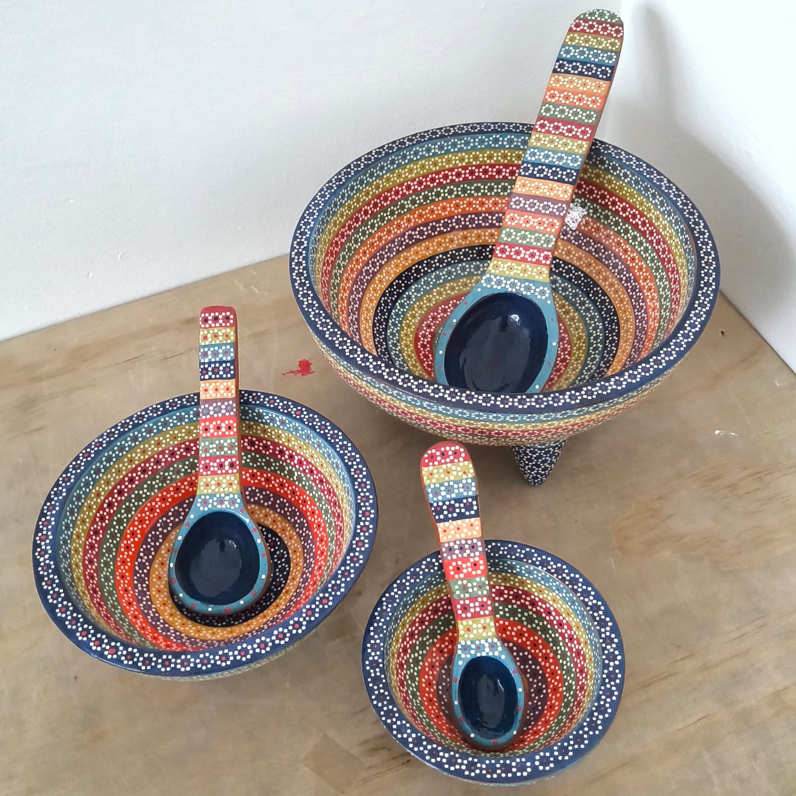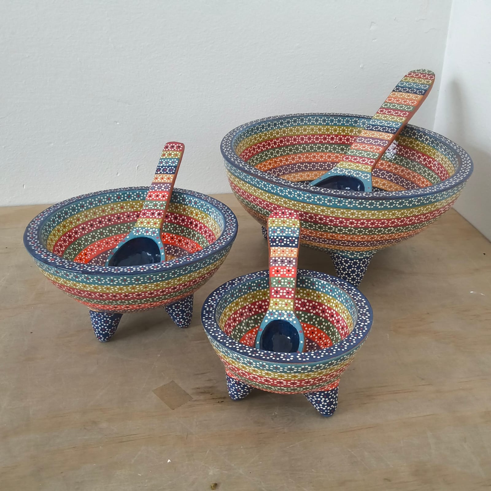 | Salseros/Fruteros/Recipientes en forma de molcajete originarios de Capula, con el tramado característico de la zona. Fondo de color sólido con sellos florales al rededor. Todo esmaltado y elaborado en barro. Incluyen cuchara. Pieza libre de plomo.