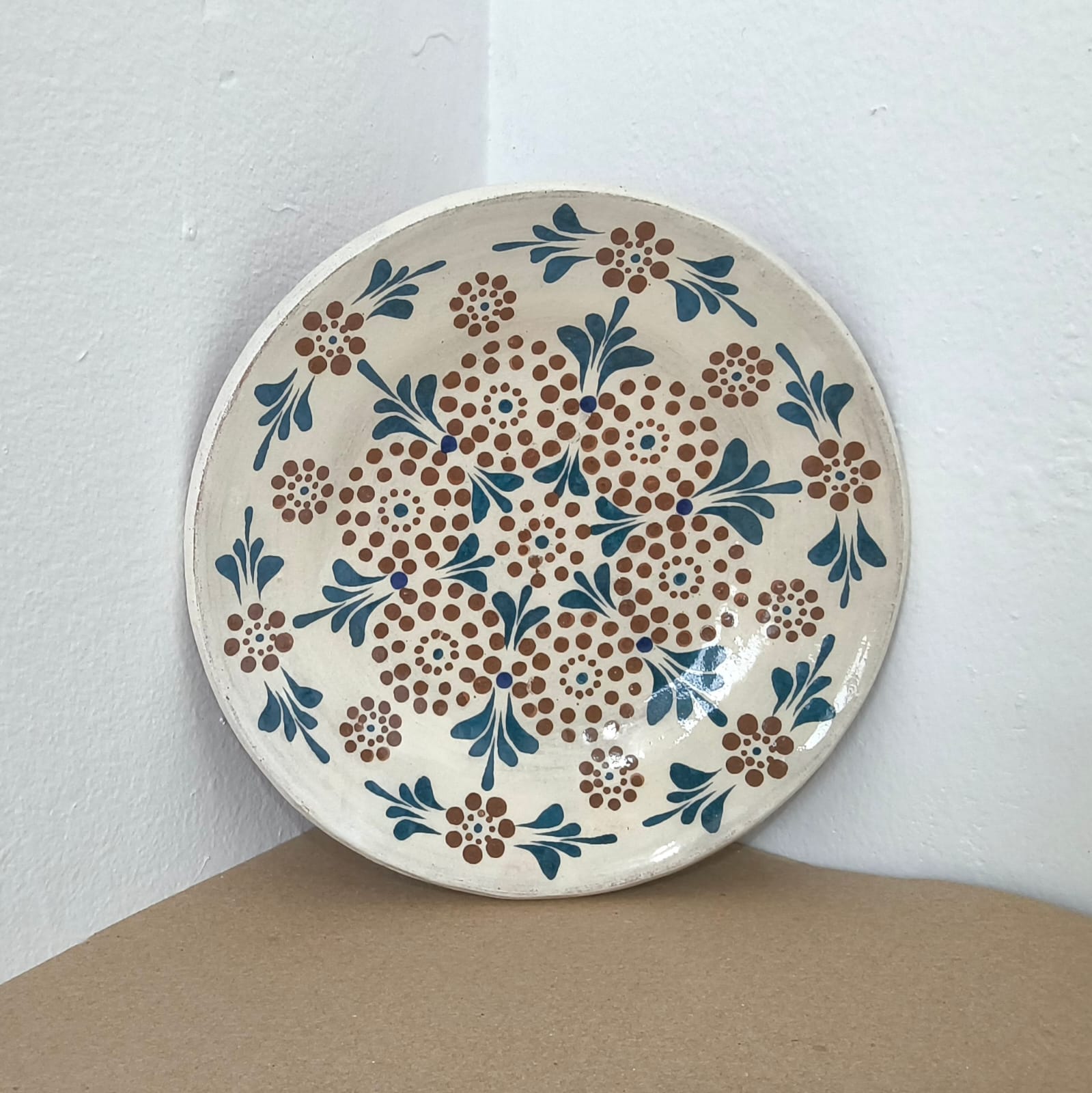 Taza STD y plato CH originarios de Capula, con el tramado característico de la zona. Fondo de color sólido con sellos florales al rededor. Todo esmaltado y elaborado en barro. Ideal para café o té. Soporta altas temperaturas. Se puede meter al horno de microondas. Piezas libres de plomo.