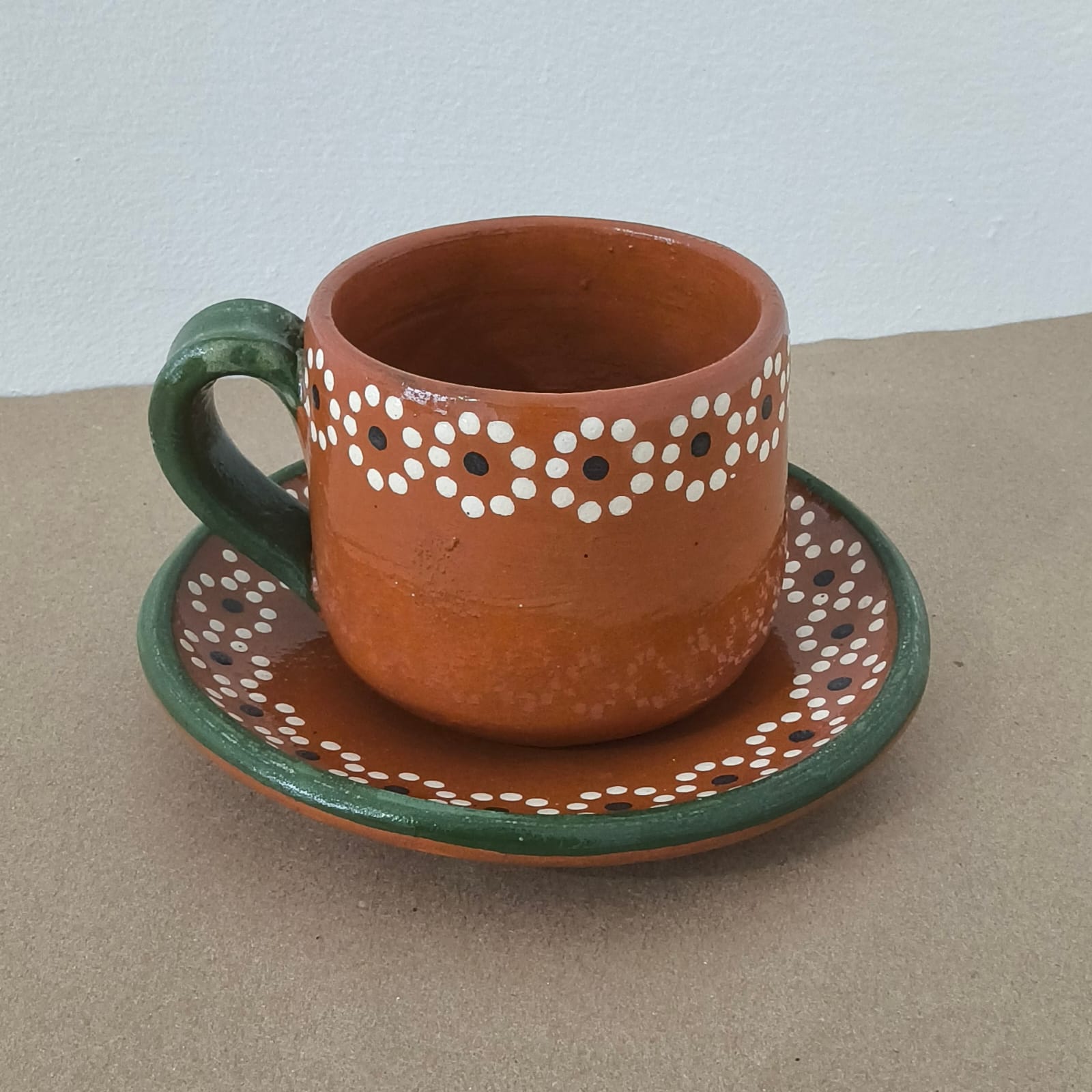 Taza STD y plato CH originarios de Capula, con el tramado característico de la zona. Fondo de color sólido con sellos florales al rededor. Todo esmaltado y elaborado en barro. Ideal para café o té. Soporta altas temperaturas. Se puede meter al horno de microondas. Piezas libres de plomo.