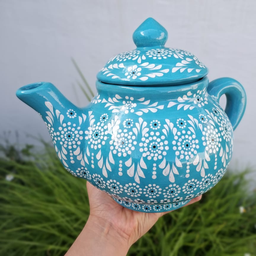 Tetera originaria de Capula, con el tramado característico de la zona. Fondo de color sólido con sellos florales al rededor. Toda esmaltada y elaborada en barro. Ideal para guisados. Se puede colocar a fuego directo. Incluye 2 piezas. Medidas: Largo de mango a servidor: 26 cms, Ancho: 16 cms., Altura: 16 cms. Pieza libre de plomo. Capacidad: 1.7 l.