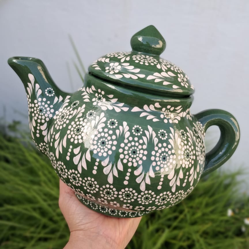 Tetera originaria de Capula, con el tramado característico de la zona. Fondo de color sólido con sellos florales al rededor. Toda esmaltada y elaborada en barro. Ideal para guisados. Se puede colocar a fuego directo. Incluye 2 piezas. Medidas: Largo de mango a servidor: 26 cms, Ancho: 16 cms., Altura: 16 cms. Pieza libre de plomo. Capacidad: 1.7 l.