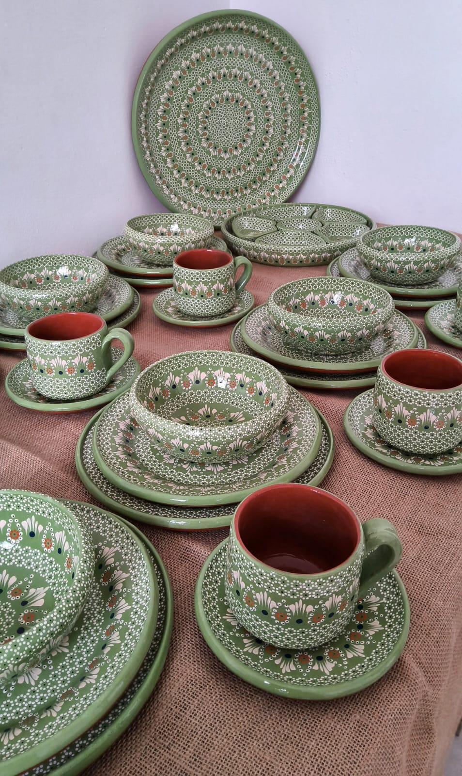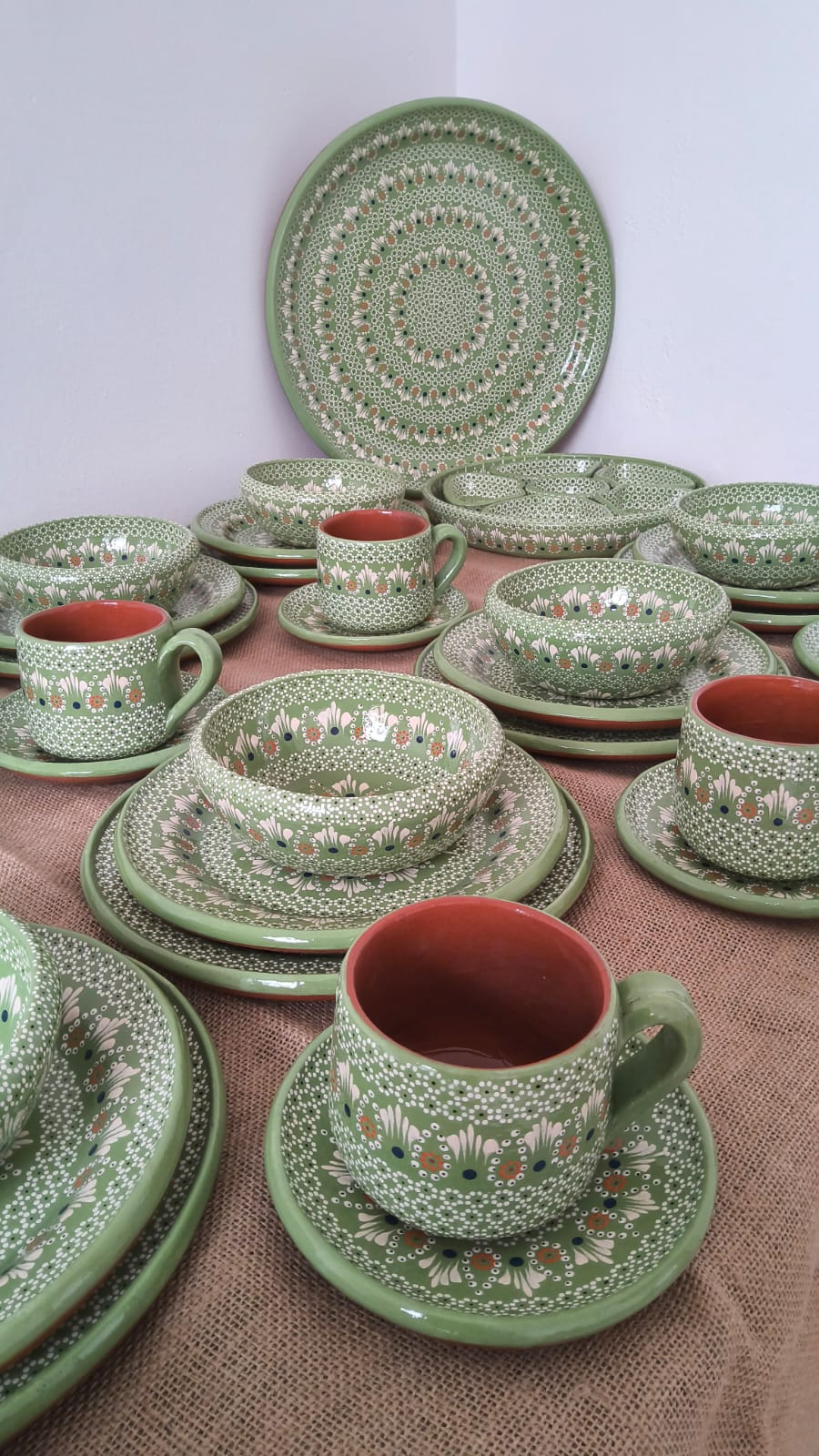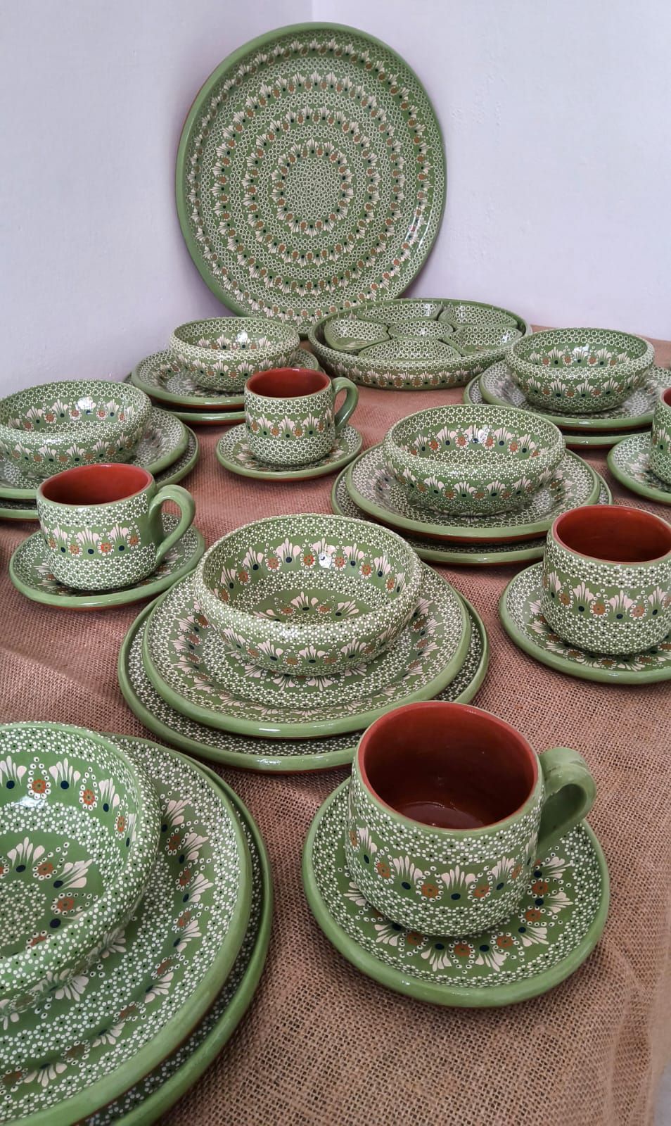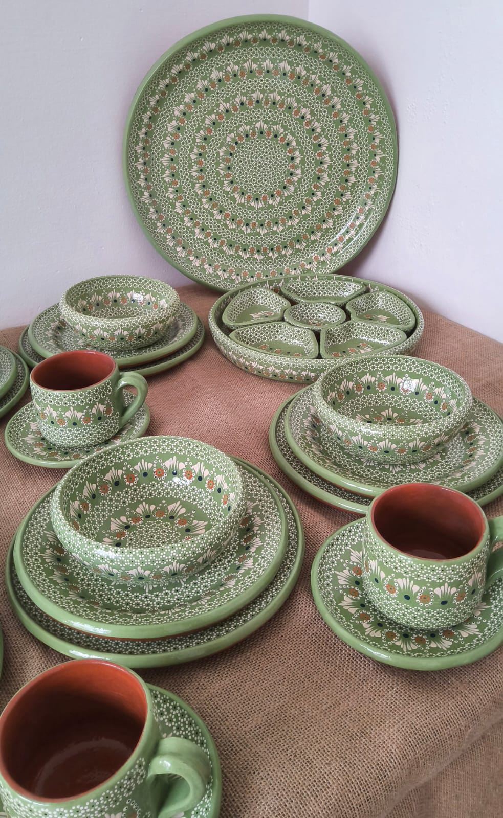 Vajilla completa para 12 personas originaria de Capula, con el tramado característico de la zona. Fondo de color sólido con sellos florales al rededor. Todo esmaltado y elaborado en barro. Incluye 62 piezas: