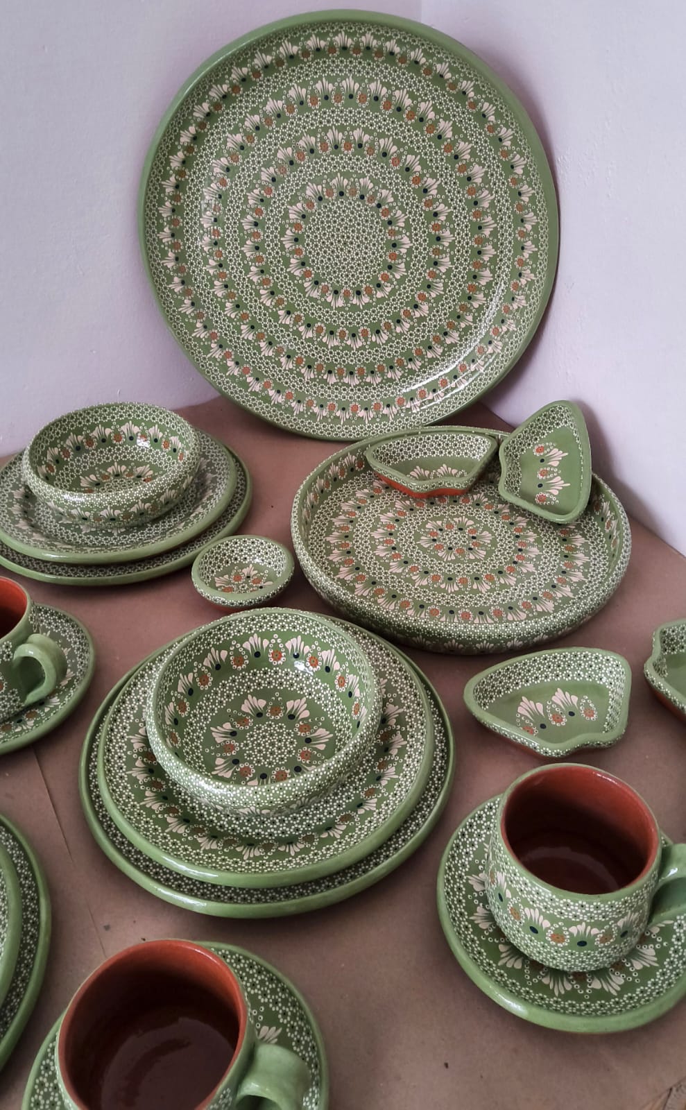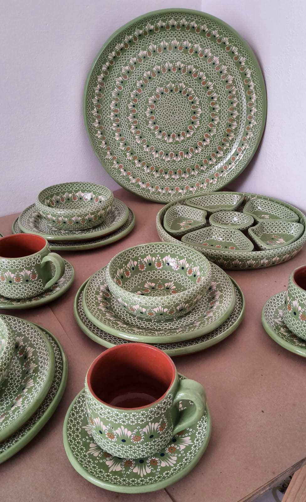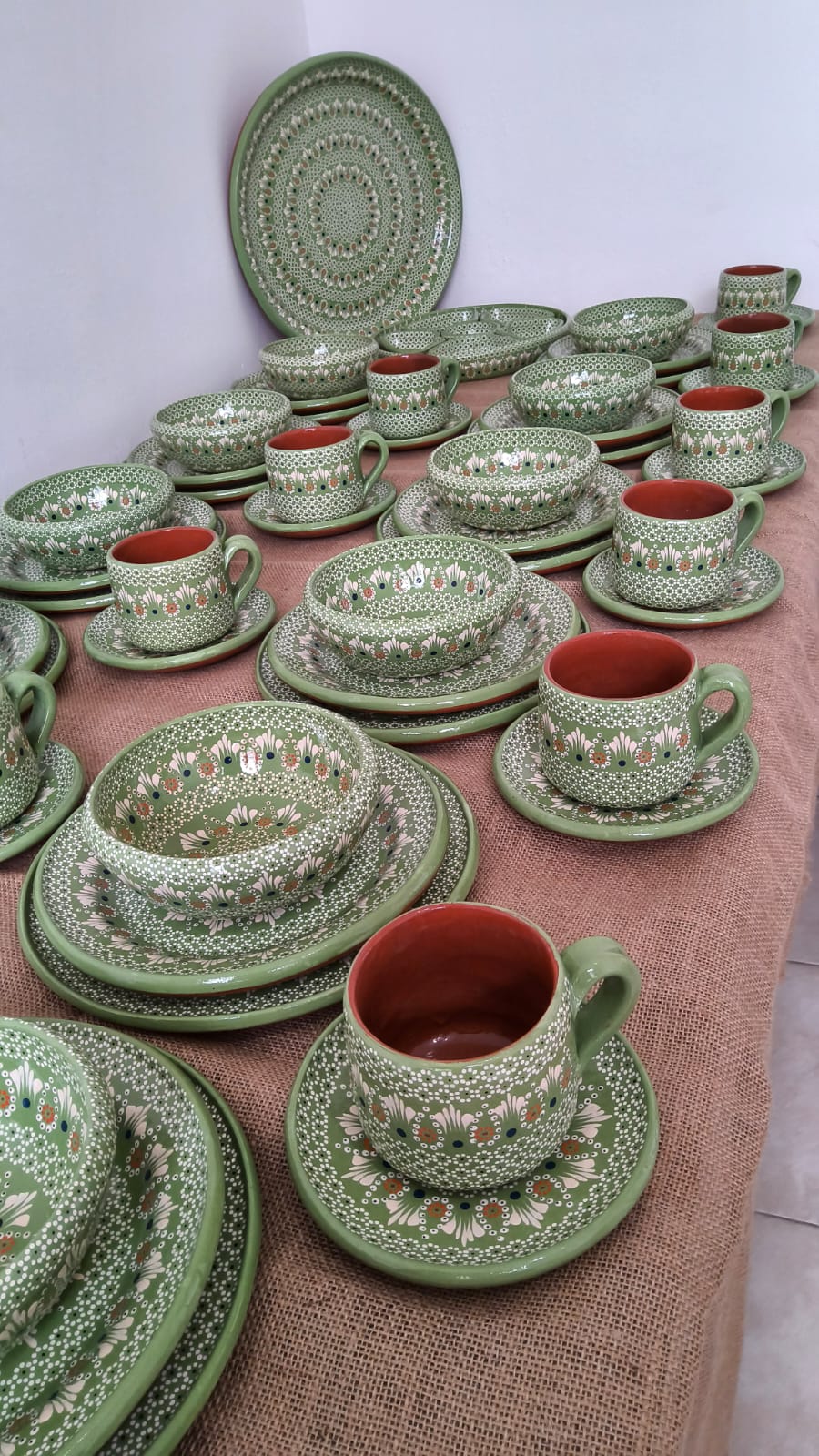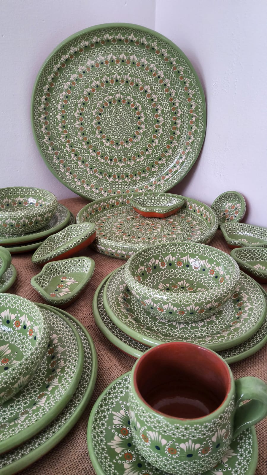 Vajilla completa para 12 personas originaria de Capula, con el tramado característico de la zona. Fondo de color sólido con sellos florales al rededor. Todo esmaltado y elaborado en barro. Incluye 62 piezas: