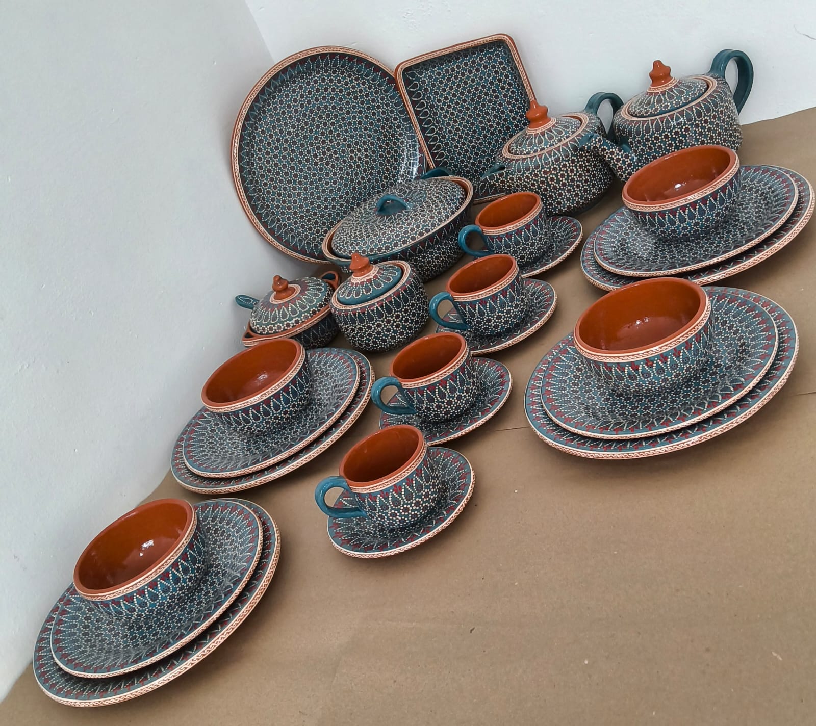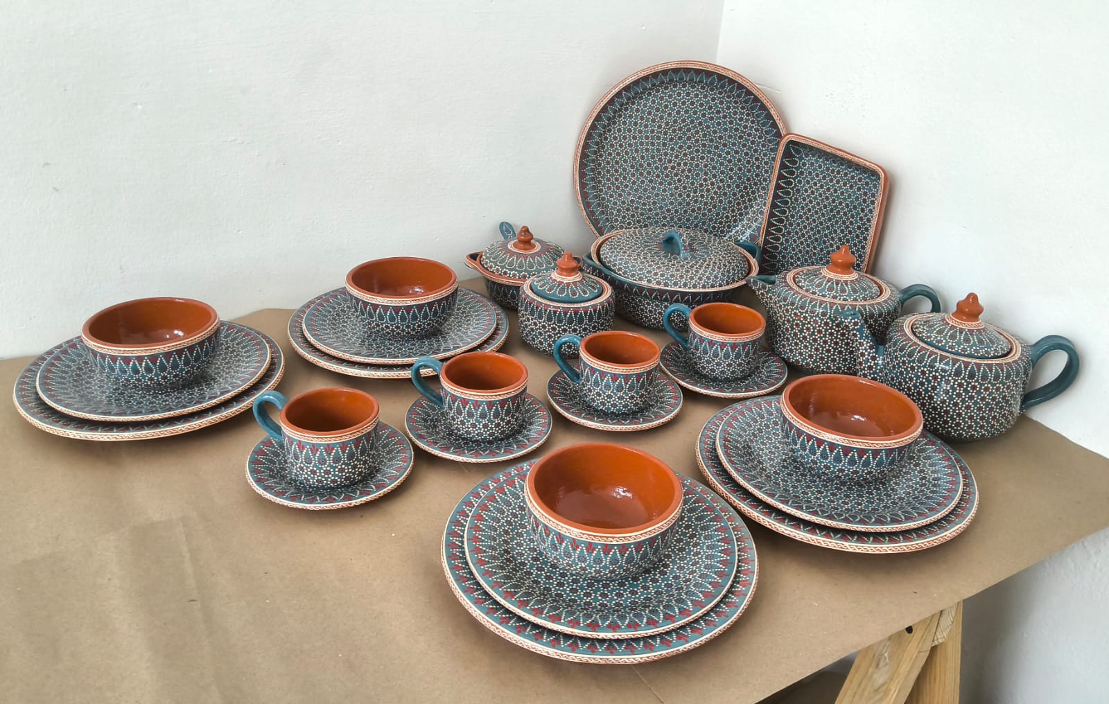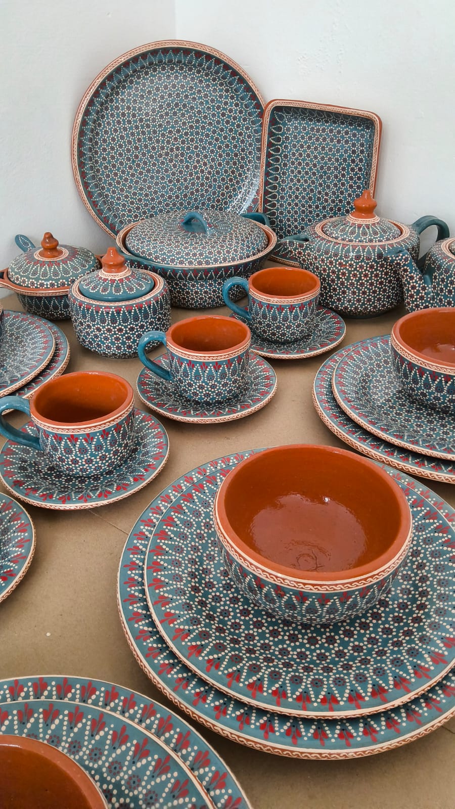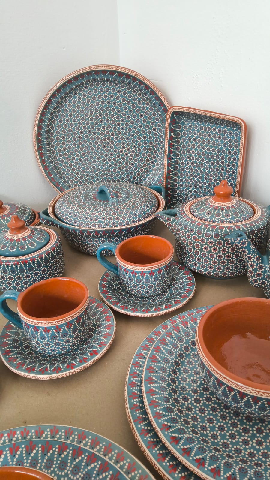 Vajilla completa para 4 personas originaria de Capula, con el tramado característico de la zona. Fondo de color sólido con sellos florales al rededor. Todo esmaltado y elaborado en barro. Incluye 27 piezas: