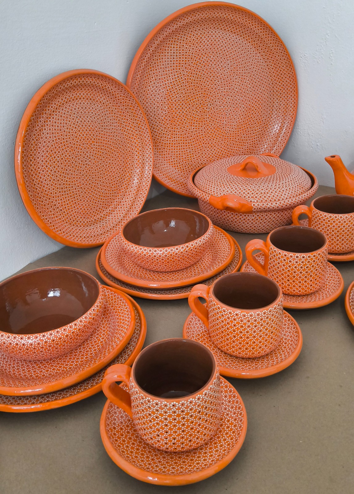 Vajilla completa para 4 personas originaria de Capula, con el tramado característico de la zona. Fondo de color sólido con sellos florales al rededor. Todo esmaltado y elaborado en barro. Incluye 27 piezas:
