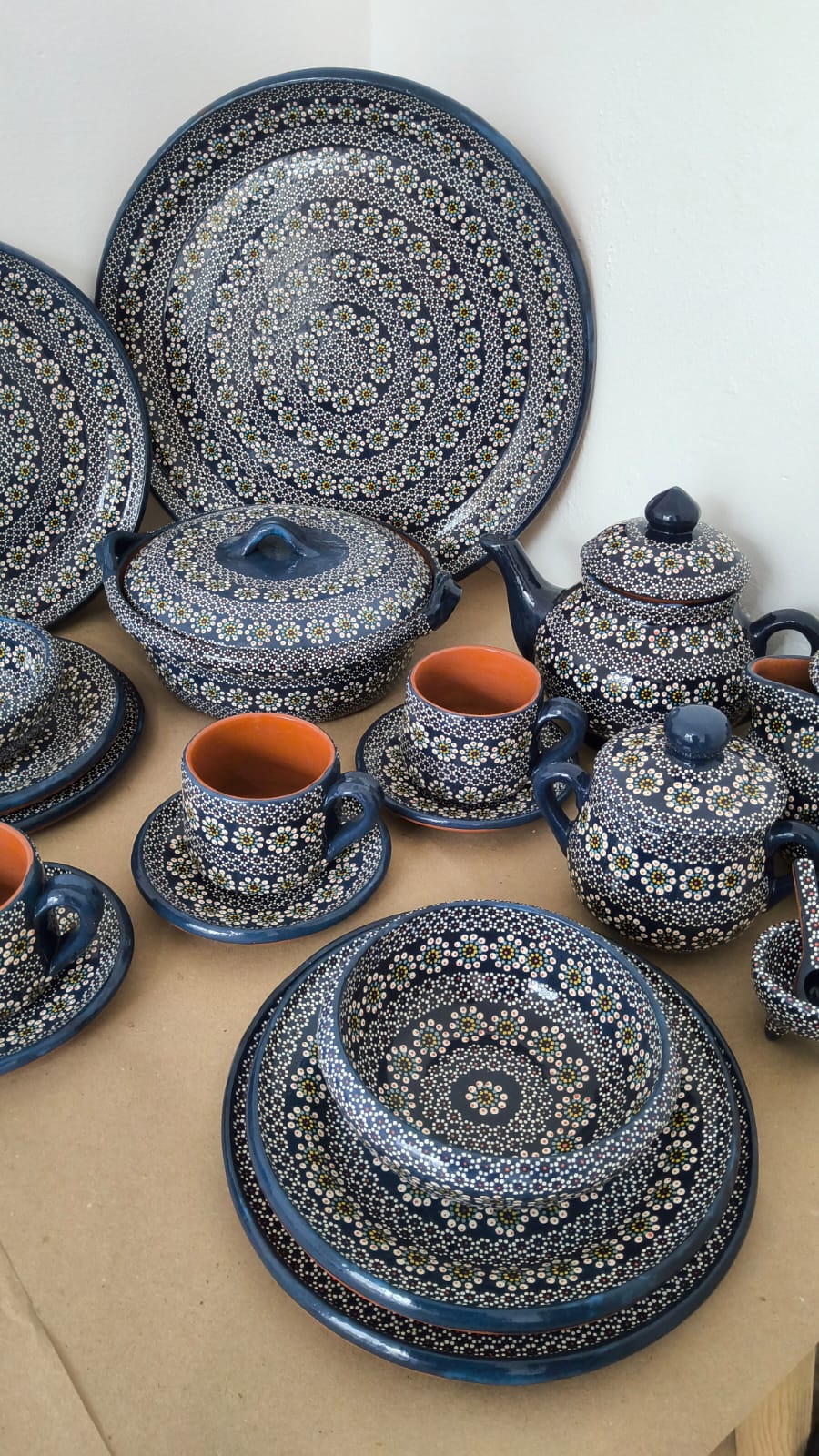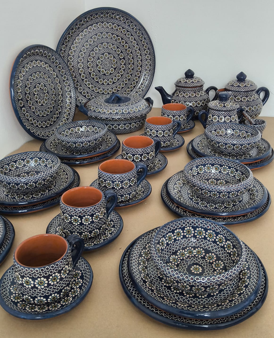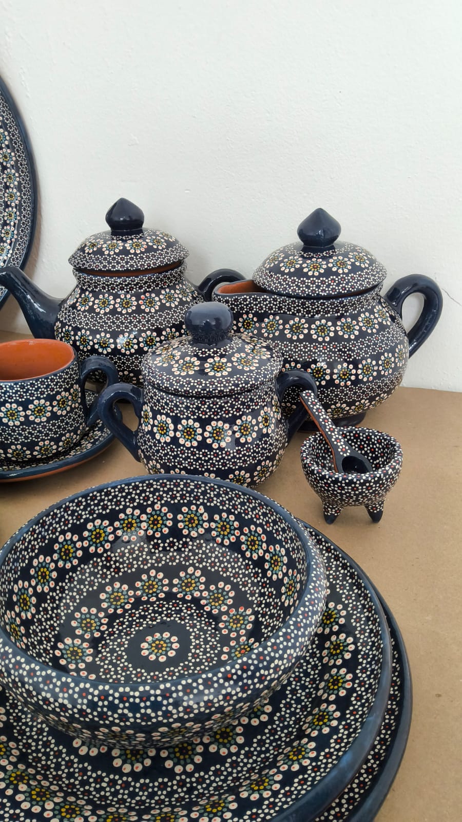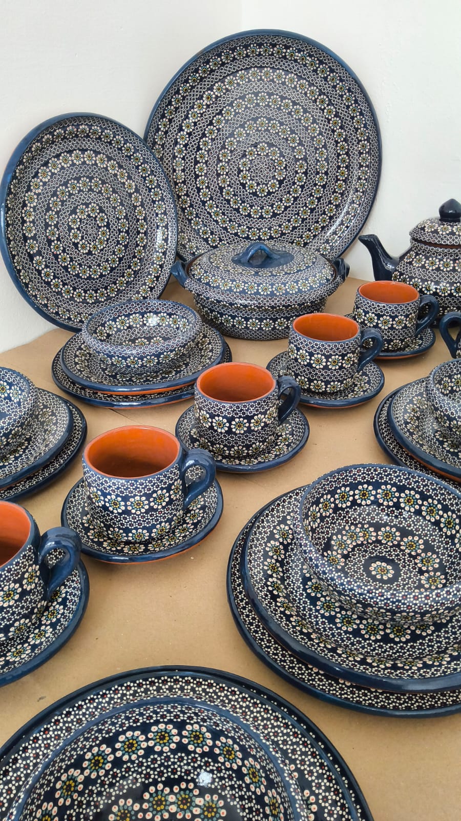 Vajilla completa para 6 personas originaria de Capula, con el tramado característico de la zona. Fondo de color sólido con sellos florales al rededor. Todo esmaltado y elaborado en barro. Incluye 37 piezas: